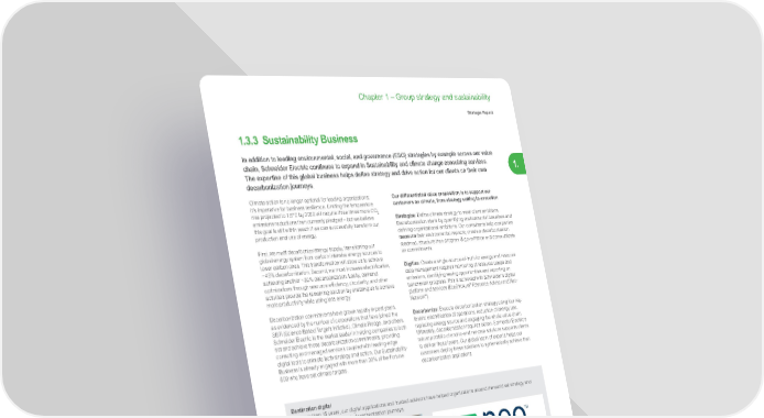 53 Life Is On | Schneider Electric www.se.com Chapter 1 – Group strategy and sustainability Strategic Report 1. 1.3.3 Sustainability Business In addition to leading environmental, social, and governance (ESG) strategies by example across our value chain, Schneider Electric continues to expand in Sustainability and climate change consulting services. The expertise of this global business helps define strategy and drive action for our clients on their own decarbonization journeys. Climate action is no longer optional for leading organizations: it’s imperative for business resilience. Limiting the temperature rise projected to 1.5°C by 2050 will require three times more CO 2 emissions reductions than currently pledged – but we believe this goal is still within reach if we can successfully transform our production and use of energy. First, we must decarbonize energy supply, transitioning our global energy system from carbon intensive energy sources to lower carbon ones. This transformation will allow us to achieve ~45% decarbonization. Second, we must increase electrification, achieving another ~30% decarbonization. Lastly, demand optimizations through resource efficiency, circularity, and other activities provide the remaining solution by enabling us to achieve more productivity while using less energy. Decarbonization commitments have grown rapidly in past years, as evidenced by the number of corporations that have joined the SBTi (Science Based Targets Initiative), Climate Pledge, and others. Schneider Electric is the market leader in helping companies to both set and achieve these decarbonization commitments, providing consulting and managed services coupled with leading-edge digital tools to animate both strategy and action. Our Sustainability Business is already engaged with more than 30% of the Fortune 500 who have set climate targets. Our differentiated value proposition is to support our customers on climate, from strategy setting to execution Strategize : Define climate strategy to meet client ambitions. Decarbonization starts by quantifying environmental baselines and defining organizational ambitions. Our consultants help companies measure their environmental impacts, create a decarbonization roadmap, structure their program & governance and communicate on commitments. Digitize : Create a single-source-of-truth for energy and resource data management requires monitoring of resource usage and emissions, identifying saving opportunities and reporting on benchmark progress. This is achieved with Schneider’s digital platform and services (EcoStruxure ™ Resource Advisor and Neo- Network ™ ). Decarbonize : Execute decarbonization strategy using four key levers: electrification of operations, reduction of energy use, replacing energy source and engaging the whole value chain. Ultimately, decarbonization requires action. Schneider Electric’s robust portfolio of end-to-end net-zero solutions supports clients to deliver those levers. Our global team of experts helps our customers deploy these solutions to systematically achieve their decarbonization aspirations. Destination digital For more than 15 years, our digital applications and trusted advisors have helped organizations around the world set strategy and execute action to enable their decarbonization journeys. EcoStruxure ™ Resource Advisor, Schneider Electric’s award-winning digital enterprise sustainability management application, complements the services delivered by its Sustainability Business. Underpinned by client specific data, Resource Advisor’s robust AI-supported reporting and management capabilities enable users across the C-suite, finance, sustainability, procurement, operations, and other functions to find quick answers and drive meaningful value to their organizations. NEO Network ™ , is Schneider Electric’s digital peer-to-peer community of organizations advancing reliable and cost- effective renewable energy, cleantech, and decarbonization solutions around the world. NEO Network simplifies the solution buying process by connecting members to trusted experts, viable projects and technologies, and exclusive market intelligence to enable and accelerate transaction decisions. With more than 500 corporate members, 30+ gigawatts of renewable capacity available for corporate offtake, and leading- edge digital analytics apps, NEO Network is positioned to play a crucial role in the rapidly evolving renewables market by engaging supply and demand actors in a thriving community.