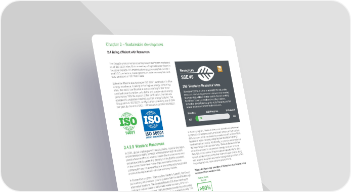 www.se.com Schneider Electric Universal Registration Document 2021 152 Chapter 2 – Sustainable development 2.4 Being efficient with Resources The Group’s environmental reporting scope and targets are based on all ISO 14001 sites. Environment reporting metrics are shown in the table on page 226 and include energy consumption, Scope 1 and 2 CO 2 emissions, waste generation, water consumption, and VOC emissions at ISO 14001 sites. Schneider Electric also leverages ISO 50001 certification to drive energy excellence, focusing on the highest energy-consuming sites. ISO 50001 certification is complementary to ISO 14001 certification and enables us to define and sustain robust energy governance. With the support of this certification, the sites are equipped to understand and reduce their energy footprint. The Group aims to ISO 50001-certify all sites consuming over 5 GWh per year. By the end of 2021, 140 sites were certified ISO 50001. 2.4.2.5 Waste to Resources In 2021, global challenges with supply chains, material shortages, and increased visibility towards waste pollution such as ocean plastics have reaffirmed what Schneider Electric has known and strived towards for years: the depletion of the Earth’s resources in the current linear take-make-dispose models of resource consumption are not economically or environmentally sustainable and must be replaced with circular economy models. In its previous program, Towards Zero Waste to Landfill, the Group put a strong emphasis on diverting waste from the landfills through alternative solutions. The Group achieved 206 sites meeting its stringent requirements of 99% metal waste recovery, 97% non- metal waste recovery, and 100% hazardous waste recovery using the best available handling/treatment options available locally. This helped the Group to achieve 96% waste recovery across its operations overall. 2017 2018 2019 2020 2021 2030 94% 95% 95% 96% 96% 100% 100% Waste Recovery Performance NAM Europe APAC Rest of the World Target 200 ‘Waste-to-Resource’ sites Schneider Electric is driven to maximize the value of its resources, considering waste as a resource and ensuring its waste stays within a circular system. Beyond avoiding landfill and looking at traditional recycling solutions, Schneider strives to move up the waste hierarchy and find reduce and reuse solutions for its resources. Resources SSE #9 200 120 Baseline 2025 target 2021 Progress 0 100 126 In its new program, ‘Waste-to-Resource’, Schneider pushes even further with its waste recovery ambitions. Sites now must achieve 99% recovery for all non-hazardous waste and still achieve 100% hazardous waste recovery using the best available handling/ treatment options locally. Additionally, to promote and emphasize the importance of circular economy, ‘Waste-to-Resource’ sites will not be allowed to use waste-to-energy solutions for more than 10% of their waste. This provides an opportunity for sites to work collaboratively within their internal supply chains, along with external suppliers and waste management providers to find innovative reduce, reuse, and recycle solutions. ‘Waste-to-Resource’ ambition at Schneider: maximising value recovered from waste in sites Waste to Energy <10% Landfill <1% >90% Reduce, Reuse, Recycle