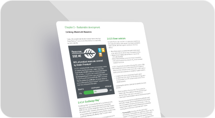www.se.com Schneider Electric Universal Registration Document 2021 158 Chapter 2 – Sustainable development 2.4 Being efficient with Resources Today, 78% of Schneider Electric’s product sales come from Green Premium ™ products and the ambition is to reach 80% by 2025 (SSE #6). 80% of product revenues covered by Green Premium ™ In 2021, Schneider Electric received an increasing number of customer inquiries requesting detailed information regarding the material content and environmental impacts of its products. In response, the Industrial Automation Environmental Experts of the Group generated more than 75 new Product Environmental Profile (PEP) documents. This has enabled the certification of a larger amount of products through the Green Premium ™ program to deliver even more transparent information. Resources SSE #6 80% 77% Baseline 2025 target 2021 Progress 0 100 78% 2.4.3.4 EcoDesign Way ™ EcoDesign Way ™ is Schneider Electric’s proprietary process, deployed on product development projects of more than EUR 300,000. It is fully integrated in the Group’s Offer Creation Processes (OCP), mandatory deliverables, and encompasses all involved functions: Marketing, Quality, Design, Supply Chain, and Project Manager. EcoDesign Way ™ involves 3 steps: 1 Identification of relevant environmental performance for customers with inputs from marketing 2 Research and assessment of alternative solutions to target the selected environmental performance 3 Once performance is reached, draft of a marketing pitch. The EcoDesign Way ™ scorecard is fully aligned with all Green Premium ™ value propositions. Moreover, several initiatives have been launched to embed EcoDesign Way ™ earlier in the OCP with strong inputs from the Future Offer Manager to foster innovation and increase EcoDesign Way ™ ’s positive impact. For instance, a simplified Life Cycle Assessment tool was deployed to assess t he environmental potential of incubated projects. In 2021, Schneider Electric initiated a revamp of the EcoDesign Way ™ process to better include the latest global sustainability programs such as Green Materials and Green Packaging. The new eco-design process is expected to be more integrated within the Agile framework Schneider is deploying globally. The process should also involve the assessment of CO 2 emissions at a very early stage in the creation of new offers in order to encourage oriented investments. Moreover, the new eco-design process will not be limited to products but will also include systems/architectures. Finally, the revamping of ecodesign will be the opportunity to enhance sustainable innovation DNA by developing training and coaching modules for the project teams. 2.4.3.5 Green materials Schneider Electric has committed to increase green materials use in its products to 50% by 2025, as part of Schneider Sustainability Impact (SSI #4). With that long-term commitment, the Group aims to: • Be a change agent to accelerate the transformation toward a low-carbon and circular economy of the material industry; • Reduce Scope 3 supply chain emissions, in line with the 1.5°C carbon pledge; • Differentiate Schneider products from those of competitors in the eyes of customers by using low CO 2 , circular, and safer materials in products. In 2021, Cross-functional experts at Schneider (Procurement, R&D, Environment) have worked in close relationship with suppliers to define the Green attributes for each commodity in scope, based on existing international schemes and standards. A green material is: • A material with a lower environmental footprint; and/or • A material that is the output of an industrial technology which is a key enabler for a 1.5°C climate scenario and/or a more circular economy. Considering this definition, Schneider has identified two levers of action: • Build traceability in the value chain. This is a priority for metals today, where visibility on the environmental impact and technology-origin of procured metals is low. • Select green materials based on a lower environmental footprint. The lower environmental footprint attributes are defined for each commodity in scope, as the environmental performance of metal cannot be based on the same attributes as plastic. In 2021, the scope of green materials focused on three types of commodities covering about a third of purchased materials in volume: • Thermoplastics (including both direct and indirect procurement). Thermoplastics are qualified as “Green” when the supplier is bringing evidence of a minimum recycled content, biobased content (minimum threshold depends on whether the compound is halogenated or not) or is using a green flame retardant. • Steel (direct purchases). Steel is qualified as “Green” when the supplier is bringing evidence that the mill of origin is an Electric Arc Furnace (EAF) or has a Green certificate such as the ones delivered by Responsible Steel. • Aluminum (direct purchases). Aluminum is qualified as “Green” when the supplier is bringing evidence that the product carbon footprint is below 8 tonnes of CO 2 per ton of Aluminum, is using a minimum of 90% of recycled content in its product or that the mill of origin has a Green certificate such as the ones delivered by the Aluminum Stewardship Initiative. Volume and distribution of green materials (in kt) 110 220 30 Steel Thermoplastics Aluminum