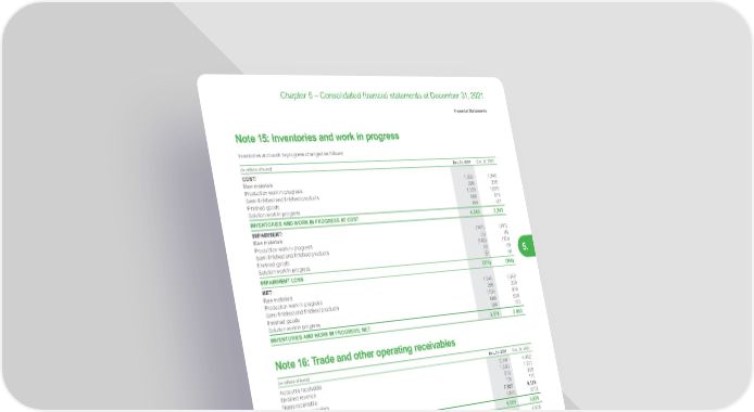 373 Life Is On | Schneider Electric www.se.com Financial Statements 5. Chapter 5 – Consolidated financial statements at December 31, 2021 Note 15: Inventories and work in progress Inventories and work in progress changed as follows: (in millions of euros) Dec. 31, 2021 Dec. 31, 2020 COST: Raw materials 1,832 1,240 Production work in progress 295 235 Semi-finished and finished products 1,323 1,085 Finished goods 696 516 Solution work in progress 199 167 INVENTORIES AND WORK IN PROGRESS AT COST 4,345 3,243 IMPAIRMENT: Raw materials (187) (191) Production work in progress (9) (6) Semi-finished and finished products (165) (151) Finished goods (8) (8) Solution work in progress (5) (4) IMPAIRMENT LOSS (374) (360) N E T: Raw materials 1,645 1,049 Production work in progress 286 229 Semi-finished and finished products 1,15 8 934 Finished goods 688 508 Solution work in progress 194 163 INVENTORIES AND WORK IN PROGRESS, NET 3,971 2,883 Note 16: Trade and other operating receivables (in millions of euros) Dec. 31, 2021 Dec. 31, 2020 Accounts receivable 5 ,141 4,482 Unbilled revenue 1,500 1,231 Notes receivable 510 308 Advances to suppliers 176 115 Accounts receivable at cost 7, 327 6 ,13 6 Impairment (498) (510) ACCOUNTS RECEIVABLE, NET 6,829 5,626 On time 6,091 4,906 Less than one month past due 324 389 One to two months past due 163 150 Two to three months past due 79 85 Three to four months past due 100 46 More than four months past due 72 50 Accounts receivable result from sales to end-customers, who are widely spread both geographically and economically. Consequently, the Group believes that there is no significant concentration of credit risk. In addition, the Group takes out substantial credit insurance and uses other types of guarantees to limit the risk of losses on trade accounts receivable. Changes in provisions for impairment of short and long-term trade accounts receivable were as follows: (in millions of euros) Full year 2021 Full year 2020 Provisions for impairment on January 1 (510) (459) Additions (82) (141) Utilizations 30 91 Reversal of surplus provisions 67 51 Translation adjustments (25) 37 Changes in scope of consolidation and other 22 (89) PROVISIONS FOR IMPAIRMENT ON DECEMBER 31 (498) (510)