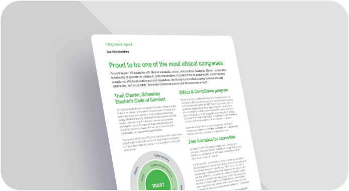 www.se.com Schneider Electric Universal Registration Document 2021 38 Integrated report Proud to be one of the most ethical companies Present in over 100 countries with diverse standards, values, and practices, Schneider Electric is committed to behaving responsibly in relation to all its stakeholders. Convinced that its responsibility extends beyond compliance with local and international regulations, the Group is committed to doing business ethically, sustainably, and responsibly. Schneider’s business actions and decisions run on trust. Trust Charter, Schneider Electric’s Code of Conduct In 2021, Schneider Electric evolved its Principles of Responsibility to the Trust Charter, acting as the Group’s Code of Conduct and demonstrating its commitment to ethics, safety, sustainability, quality, and cybersecurity. Schneider Electric believes that trust is a foundational value. It is earned. It serves as a compass, showing the true north in an ever more complex world and Schneider Electric considers it to be core to its environment, sustainability, and governance commitments. Trust powers all Schneider Electric’s interactions with stakeholders and all relationships with customers, shareholders, employees, and the communities they serve, in a meaningful, inclusive and positive way. TRUST T e a m s C u s t o m e r s a n d P a r t n e r s C u s t o m e r s a n d P a r t n e r s I n v e s t o r s C o m m u n i t i e s E t h i c s C y b e r s e c u r i t y S a f e t y Q u a l i t y S u s t a i n a b i l i t y Read more about our Trust Charter on page 94 Ethics & Compliance program Driven by and in complement to the Trust Charter, the Ethics & Compliance (E&C) program establishes the framework of policies, tools and processes related to E&C topics. By providing specific guidelines and practices, the program ensures the business is run with integrity, and employees are aware of potential risks. As part of this program, all employees have access to the Trust Line, Schneider’s whistleblowing system, to speak up in case of unethical conduct, with the guarantee of the whistleblower protection. Schneider has built a strong governance to lead the Ethics & Compliance program to the highest standards, with responsibilities at board, executive, corporate, and operational levels. Zero tolerance for corruption Schneider Electric has a zero tolerance policy with regard to corruption. This commitment is materialized through a strong and continuously developing Anti-Corruption Compliance program, which is part of the E&C program. In 2020 and 2021, a set of anti-corruption e-learnings was built to provide guidance on real life risk scenarios and to take into account the trainees’ needs and expectations. This led to a curriculum of modules of e-learnings, deployed in 2020 and completed in 2021 with four additional modules about facilitation payments, conflict of interest, conditions that make people commit the wrongdoing, and how to raise concerns in Schneider Electric. The modules were supported by top leaders’ videos demonstrating the “tone at the top” on this crucial matter and are available in 14 languages. Read more about our Ethics and Compliance program on page 95 Our Stakeholders 2021 highlights 96% employees trained on Cybersecurity and Ethics. 81% of our employees are confident to report unethical conduct. 26% of confirmed cases raised via the Trust Line lead to actions. Ethisphere Institute – One of the 2021 World’s Most Ethical Companies.