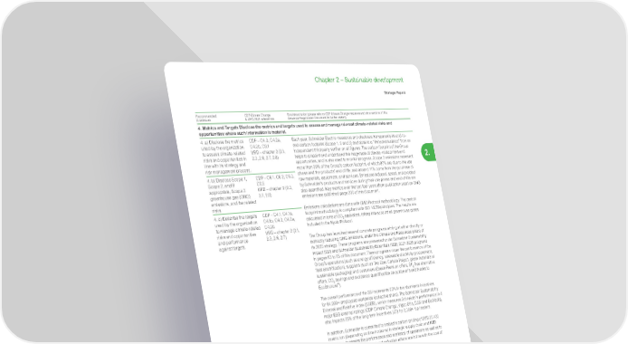 223 Life Is On | Schneider Electric www.se.com Chapter 2 – Sustainable development Strategic Report 2. Recommended Disclosure CDP Climate Change & URD 2021 references Brief description (please refer to CDP Climate Change response and other sections of this Universal Registration Document for further details) 4. Metrics and Targets Disclose the metrics and targets used to assess and manage relevant climate-related risks and opportunities where such information is material. 4. a) Disclose the metrics used by the organization to assess climate-related risks and opportunities in line with its strategy and risk management process. CDP – C4.2, C4.2a, C4.2b, C9.1 URD – chapter 2 (2.1, 2.3, 2.6, 2.7, 2.8) Each year, Schneider Electric measures and discloses transparently its end-to- end carbon footprint (Scope 1, 2 and 3) and obtains a “limited assurance” from an independent third party verifier on all figures. The carbon footprint of the Group helps to pinpoint and understand the magnitude of climate-related risks and opportunities, and is also used to monitor progress. Scope 3 emissions represent more than 99% of the Group’s carbon footprint, of which 87% are due to the use phase and the products’ end of life, and around 11% come from the purchase of raw materials, equipment, and services. Emissions induced, saved, and avoided by Schneider’s products and services during their use phase and end-of-life are also quantified. Key metrics over the last four years (from publication year) on GHG emissions are published page 230 of this document. Emissions calculations are done with GHG Protocol methodology. The carbon footprint methodology is compliant with ISO 14069 principles. The results are calculated in tons of CO 2 equivalent, taking into account all greenhouse gases included in the Kyoto Protocol. The Group has launched several concrete programs aiming at either directly or indirectly reducing GHG emissions, under the Climate and Resources pillars of its 2025 strategy. These programs are presented under Schneider Sustainability Impact (SSI) and Schneider Sustainability Essentials (SSE) 2021-2025 programs in pages 63 to 65 of this document. These programs cover the performance of the Group’s operations (such as energy efficiency, renewable electricity procurement, fleet electrification), suppliers (such as The Zero Carbon Project, green materials or sustainable packaging) and customers (Green Premium offers, SF 6 -free alternative offers, CO 2 savings and avoidance quantification on customer’s end thanks to EcoStruxure ™ ). The overall performance of the SSI represents 20% in the short-term incentives for 64,000+ employees worldwide (collective share). The Schneider Sustainability External and Relative Index (SSERI), which measures Schneider’s performance in 4 major ESG external ratings (CDP Climate Change, Vigeo Eiris, DJSI and EcoVadis), also impacts 25% of the long-term incentives (LTI) for 2,300+ top leaders. In addition, Schneider is committed to embed a carbon pricing of EUR 30-130 /metric ton (depending on time horizons) in strategic supply chain and R&D decisions, to assess the performance and resiliency of operations as well as to assess whether the investment and reduction efforts are in line with the cost of CO 2 externality. Schneider Electric is a signatory of the Business Ambition for 1.5°C initiative aimed at setting Greenhouse Gas (GHG) emissions reduction targets in line with the global effort to limit warming to 1.5°C. Group short to medium-term targets: • Before 2025, demonstrate that Schneider Electric is carbon positive together with its customers and partners, thanks to CO 2 savings delivered by EcoStruxure ™ ; • On the Group’s operations (scope 1 and 2): be carbon neutral by 2025 (allowing CO 2 offsets) and net-zero CO 2 emissions by 2030; • On indirect emissions (scope 3) in its supply chain and with customers: reduce emissions by -35% by 2030 (versus 2017), by actively engaging suppliers to accelerate their climate strategy, by sourcing greener materials and by proposing more efficient solutions to its customers. The Group’s 2030 targets (net-zero CO 2 emissions on scope 1 and 2, and -35% on scope 3) have been validated 1.5°C-aligned by the Science-Based Target initiative in 2019. Group long-term targets • Become carbon neutral on the Group’s full end-to-end footprint by 2040 (scope 1, 2, and 3), 10 years ahead of 1.5 °C trajectory. This means that all Schneider Electric’s products will be carbon neutral in 2040; • Engage with suppliers to move towards a net-zero CO 2 supply chain by 2050. 4. b) Disclose Scope 1, Scope 2, and if appropriate, Scope 3 greenhouse gas (GHG) emissions, and the related risks. CDP – C6.1, C6.2, C6.3, C6.5 URD – chapter 2 (2.3, 2.7, 2.8) 4. c) Describe the targets used by the organization to manage climate-related risks and opportunities and performance against targets. CDP – C4.1, C4.1a, C4.1b, C4.2, C4.2a, C4.2b URD – chapter 2 (2.1, 2.3, 2.6, 2.7)