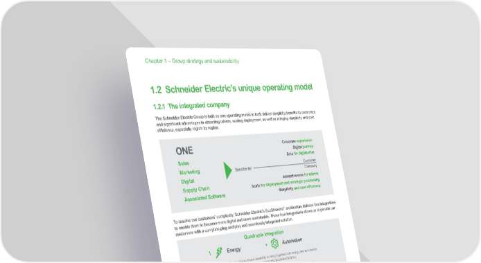 www.se.com Schneider Electric Universal Registration Document 2021 46 Chapter 1 – Group strategy and sustainability 1.2 Schneider Electric’s unique operating model 1.2.1 The integrated company The Schneider Electric Group is built as one operating model to both deliver simplicity benefits to customers and significant advantages in attracting talents, scaling deployment, as well as bringing simplicity and cost efficiency, especially region by region. ONE Sales Marketing Digital Supply Chain Associated Software Benefits for Customer Company Customer experience Digital journey Data for digitization Attractiveness for talents Scale for deployment and strategic positioning Simplicity and cost efficiency To resolve our customers’ complexity, Schneider Electric’s EcoStruxure ™ architecture delivers four integrations to enable them to become more digital and more sustainable. Those four integrations allows us to provide our customers with a complete plug and play and seamlessly integrated solution. Quadruple integration 1 Energy + Automation Schneider Electric has a unique capability to bring together both energy and automation to achieve greater power and process efficiency. It is this ability to differentiate, through its integrated model combining disciplines, that allows Schneider to increase customers’ benefits. 2 End Point Cloud Schneider Electric products are connected from every-end point – on the shop floor, in the infrastructure, in the cloud – so that everybody can see a digital twin of what is happening in the physical world. Our connectable products collect data, which are processed at edge or in the cloud, through the Ecostruxure ™ offering of Schneider. 3 Design & Build Operate & Maintain Schneider Electric provides software and solutions that cover the whole digital thread for customers with the offering of AVEVA, RIB Software, Planon, IGE+XAO, ETAP, and others. It allows for seamless integration of the installation’s digital life-cycle through one digital twin, from first design to operations and maintenance. 4 Site-by-Site Unified Company Management With Industry 4.0 and Industrial Internet of Things (IIoT) becoming more essential, manufacturers are requesting factory floor data anytime and anywhere around the world. Our offerings allow for integration on a whole company basis by connecting all assets and sites into one repository, allowing for efficiency at a company-wide scale – unified operations centers enable customers to optimize efficiency, investments, and carbon reduction strategies across the company (versus a site-by-site focus).