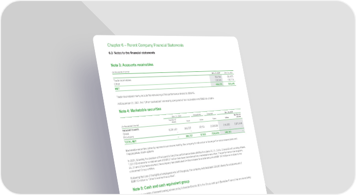 www.se.com Schneider Electric Universal Registration Document 2021 418 Chapter 6 – Parent Company Financial Statements Note 3: Accounts receivables (in thousands of euros) Dec. 31, 2021 Dec. 31, 2020 Trade receivables 351,79 9 574,675 Other 136,480 129,770 NET 488,279 704,445 Trade receivables mainly include the reinvoicing of the performance shares to SEISAS. At December 31, 2021, the “Other receivables” are mainly composed of tax receivables and R&D tax credits. Note 4: Marketable securities (in thousands of euros) Dec. 31, 2020 Acquisitions Disposals Dec. 31, 2021 Number of shares Value Value Value Value Number of shares TREASURY SHARES Gross 6,381,401 389,727 97,15 3 (138,630) 348,250 5,570,816 Provisions – – – – – TOTAL NET – 389,727 97,15 3 (138,630) 348,250 – Marketable securities primarily represent own shares held by the company for allocation to future performance shares plans and, if appropriate, stock-options. In 2021, following the decision of the board to fund the performance share distribution plans 30, 31, 31bis, 33 and 39 with existing shares. 1,521,169 shares for a total amount of EUR 97 million has been transferred into marketable securities. The performance shares plans, 30, 31 and 31bis have expired, the company has distributed 2 million shares for a total amount of EUR 124 million re-invoiced to the concerned Group entities. Following the loss of the rights of employees who left the group, the company switched back 238,101 shares for a total amount of EUR 15 million to “Other investment securities”. Note 5: Cash and cash equivalent group This item consists of interest-bearing advances by Schneider Electric SE to the Group cash pool (Boissière Finance) that are immediately recoverable on demand. Note 6: Prepayment and other assets 6.1 – Prepaid expenses The prepaid expenses relates mainly on insurance costs and fees. 6.2 – Bond issue expenses (in thousands of euros) Bond issue expenses Dec. 31, 2020 Increases Decreases Dec. 31, 2021 Sep. 27, 2012 due 2022 (USD 800 million) 576 – (450) 126 Sep. 6, 2013 due 2021 (EUR 600 million) 235 – (235) – Mar. 11, 2015 due 2025 (EUR 750 million) 1,353 – (317) 1,036 Sep. 8, 2015 due 2023 (EUR 800 million) 1,111 – (408) 703 Oct. 13, 2015 due 2025 (EUR 200 million) 468 – (95) 373 Oct. 13, 2015 due 2025 (EUR 100 million) 190 – (39) 151 Sep. 9, 2016 due 2024 (EUR 800 million) 1,653 – (445) 1,208 Dec. 13, 2017 due 2026 (EUR 750 million) 1,762 – (294) 1,468 June. 21, 2018 due 2027 (EUR 750 million) 1,644 – (254) 1,390 Sept. 9, 2019 due 2024 (EUR 200 million) 503 – (136) 367 Jan. 15, 2019 due 2028 (EUR 250 million) 630 – (89) 5 41 Jan. 15, 2019 due 2028 (EUR 500 million) 1,413 – (200) 1,213 Mar. 11, 2020 due 2029 (EUR 800 million) 2,212 – (270) 1,942 Apr. 9, 2020 due 2027 (EUR 500 million) 1,388 – (221) 1,16 7 Jun. 12, 2020 due 2023 (EUR 500 million) 1,027 – (412) 615 Nov. 24, 2020 due 2026 (EUR 650 million) 5,767 – (1,046) 4,721 TOTAL 21,933 – (4,912) 17,021 6.3 Notes to the financial statements