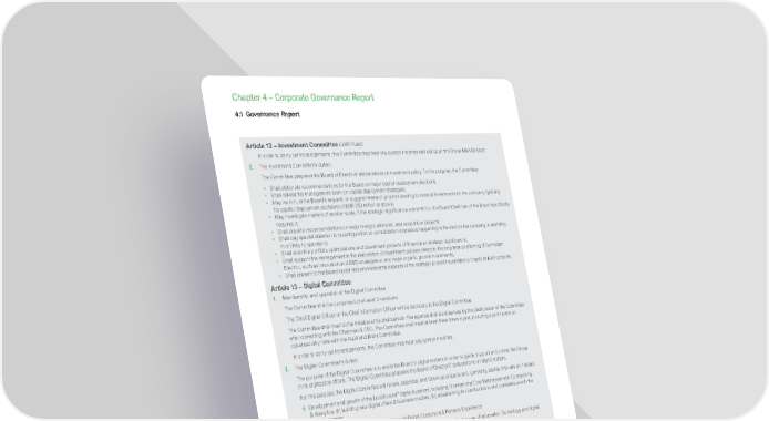 www.se.com Schneider Electric Universal Registration Document 2021 296 Chapter 4 – Corporate Governance Report Article 12 – Investment Committee continued In order to carry out its assignments, the Committee may hear any person it wishes and call upon the Group M&A Director. 2. The Investment Committee’s duties: The Committee prepares the Board of Directors’ deliberations on investment policy. To this purpose, the Committee: • Shall elaborate recommendations for the Board on major capital deployment decisions; • Shall advise the management team on capital deployment strategies; • May launch, at the Board’s request, or suggest research projects leading to material investments for the company, typically for capital deployment decisions of EUR 250 million or above; • May investigate matters of smaller scale, if the strategic significance warrants it or the Board/Chairman of the Board specifically requires it; • Shall provide recommendations on major merger, alliances, and acquisition projects; • Shall pay special attention to reconfiguration or consolidation scenarios happening in the sectors the company is operating in or likely to operate in; • Shall examine portfolio optimizations and divestment projects of financial or strategic significance; • Shall support the management in the elaboration of investment policies linked to the long-term positioning of Schneider Electric, such as innovation and R&D strategies or any major organic growth investments; • Shall present to the Board social and environmental aspects of the strategic projects submitted to it such as M&A projects. Article 13 – Digital Committee 1. Membership and operation of the Digital Committee The Committee shall be comprised of at least 3 members. The Chief Digital Officer or the Chief Information Officer will be secretary to the Digital Committee. The Committee shall meet at the initiative of its chairperson. The agenda shall be drawn up by the chairperson of the Committee after consulting with the Chairman & CEO. The Committee shall meet at least three times a year, including a joint review on cybersecurity risks with the Audit and Risks Committee. In order to carry out its assignments, the Committee may hear any person it wishes. 2. The Digital Committee’s duties: The purpose of the Digital Committee is to assist the Board in digital matters in order to guide, support and control the Group in its digitization efforts. The Digital Committee prepares the Board of Directors’ deliberations on digital matters. For this purpose, the Digital Committee will review, appraise, and follow-up projects and, generally, advise, inter alia on 7 areas: 1. Development and growth of the EcoStruxure ™ digital business, including (i) enhancing Core Businesses with Connectivity & Analytics, (ii) building new digital offers & business models, (iii) establishing its contribution to and consistence with the overall strategy; 2. Improvement and transformation of the Group’s Digital Customers & Partners Experience; 3. Improvement of Schneider Electric’s Operational Efficiency through the effective use of Information Technology and digital automation capabilities; 4. Assessment of cyber risks and enhancement of the Group’s cybersecurity posture (jointly with the Audit Committee); 5. Assessment of the contribution of potential M&A operations to the Group’s Digital strategy; 6. Monitoring and analysis of the digital landscape (competitors and disrupters, threats, and opportunities); 7. Checking that the company is equipped with the right pool of talents for digital transformation. Article 14 – Perimeter of internal regulations The present internal regulations have been unanimously approved by the Board of Directors. A purely internal act, their objective is to complete the Articles of Association by stipulating the main conditions of organization and operation of the Board of Directors. Their purpose is not to replace the Articles of Association. They may not be relied upon by shareholders or third parties for use against members of the Board of Directors, the company, or any company in the Schneider Electric Group. They may be modified at any time solely by deliberation of the Board of Directors. 4.1 Governance Report