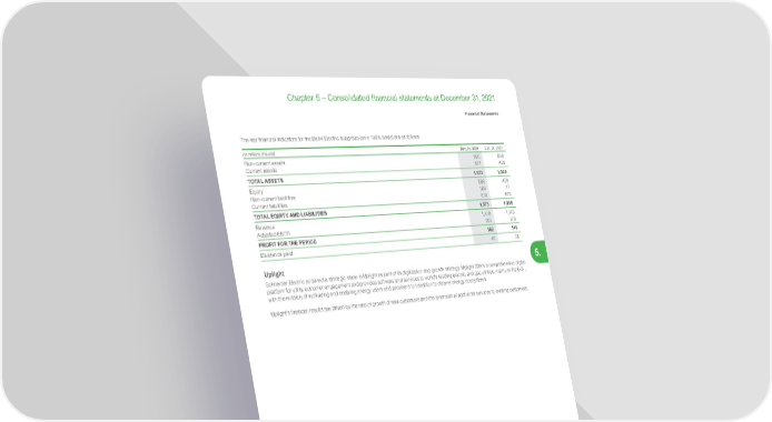 371 Life Is On | Schneider Electric www.se.com Financial Statements 5. Chapter 5 – Consolidated financial statements at December 31, 2021 The key financial indicators for the Delixi Electric subgroup (on a 100% basis) are as follows: (in millions of euros) Dec. 31, 2021 Dec. 31, 2020 Non-current assets 895 690 Current assets 677 409 TOTAL ASSETS 1,573 1,099 Equity 586 408 Non-current liabilities 168 17 Current liabilities 819 675 TOTAL EQUITY AND LIABILITIES 1,573 1,099 Revenue 1,418 1,14 5 Adjusted EBITA 201 170 PROFIT FOR THE PERIOD 162 145 Dividends paid 45 36 Uplight Schneider Electric acquired a strategic stake in Uplight as part of its digitization and growth strategy. Uplight offers a comprehensive digital platform for utility customer engagement and provides software and services to world’s leading electric and gas utilities, mainly in the U.S., with the mission of motivating and enabling energy users and providers to transition to cleaner energy ecosystems. Uplight’s financial results are driven by the rate of growth of new customers and the extension of additional services to existing customers.