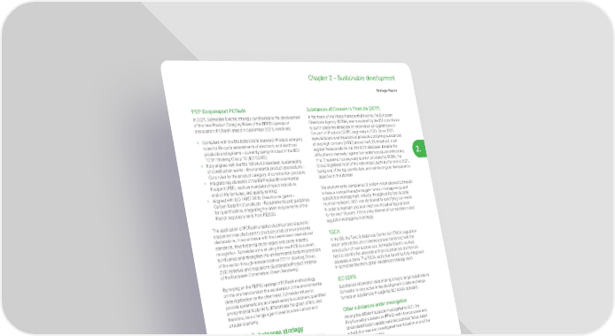 161 Life Is On | Schneider Electric www.se.com Chapter 2 – Sustainable development Strategic Report 2. PEP Ecopassport PCRed4 In 2021, Schneider Electric strongly contributed to the development of the new Product Category Rules of the PEP Ecopassport association (PCRed4 issued in September 2021), which are: • Compliant with the EN 50693:2019 standard: Product category rules for life cycle assessments of electronic and electrical products and systems – currently being mirrored in the IEC/ TC111 Working Group 15 (IEC 63366); • Fully aligned with the EN 15804+A2 standard: Sustainability of construction works – Environmental product declarations – Core rules for the product category of construction products; • Integrate key elements of the EU Product Environmental Footprint (PEF), such as mandatory impact indicators, end-of-life formulae, and quality ranking; • Aligned with ISO 14067:2018: Greenhouse gases – Carbon footprint of products – Requirements and guidelines for quantification, integrating the latest requirements of the French regulatory texts from RE2020. The application of PCRed4 enables electrical and electronic equipment manufacturers to produce product environmental declarations, in accordance with the best-known international standards, thus fostering cross-region and cross-industry recognition. Schneider aims at using this new PCR document to influence and strengthen the environmental footprint practices of the sector through standardization (TC111 Working Group, ZVEI initiative) and regulations (Sustainable Product Initiative of the European Commission, Green Taxonomy). By relying on the PEP Ecopassport PCRed4 methodology on the one hand and on the acceleration of the environmental data digitization on the other hand, Schneider strives to provide systematically and seamlessly to customers quantified environmental footprint to differentiate the green offers, and therefore, be a change agent towards a low-carbon and circular economy. 2.4.3.8 Substances strategy With increasing chemical substances regulations, raising standards from a well-being perspective, especially in the building space, and a growing number of questions from B2C and B2B customers on health matters, the ability to ensure compliance of several hundreds of thousands of product references has never been so critical. When such product traceability is mastered at scale, with robust processes and systems in place, clear business opportunities emerge, as digitization of such data is more and more needed. Schneider Electric seamlessly captures underlying data from suppliers, aggregate it, and disseminate it swiftly to customers who need that information. REACH and RoHS In Europe, the Regulation on Registration, Evaluation, Authorisation and Restriction of Chemicals (REACH) and the Restriction of Hazardous Substances in Electrical and Electronic Equipment (RoHS) directive are engaged in a refit process and Schneider actively participated in the public consultations through the professional organizations, by making some key proposals to improve efficiency and limit the administrative burden. Substances of Concern in Products (SCIP) In the frame of the Waste Framework Directive, the European Chemicals Agency (ECHA) was mandated by the EU commission to put in place the database for information on Substances of Concern In Products (SCIP), beginning in 2021. Since 2021, manufacturers and importers of products containing substances of very high concern (SVHC) above the 0.1% threshold, must register those products into this SCIP database. Despite the difficulties to manually register Schneider’s products without any IT to IT systems, nor any easy solution provided by ECHA, the Group registered most of the relevant products by the end of 2021, being one of the top contributors, and reinforcing our transparency objective in this domain. The environmental compliance IT system which allowed Schneider to have a competitive advantage in terms of transparency and substitution management, virtually throughout the last decade, must be replaced. 2021 was dedicated to specifying our needs in order to maintain and even improve this advantage at least for the next 10 years. This is a key element of our substance and regulation management strategy. TSCA In the US, the Toxic Substances Control Act (TSCA) regulation which restricts the use of chemicals was reinforced with the introduction of new substances. Schneider Electric worked hard to identify the use case of those substances and launch adequate actions. The TSCA restriction list will be fully integrated in Schneider Electric’s global substances strategy soon. IEC 62474 Substances information data sharing is key to target substitutions. Schneider is very active in the development of data exchange formats on substances through the IEC 62474 standard. Other substances under investigation Among the different subjects investigated in 2021, the Polyfluoroalkyl substances (PFAS) restriction proposal and Silver classification update were two points of focus. Lead substitution was also investigated in anticipation and will be promoted when possible.