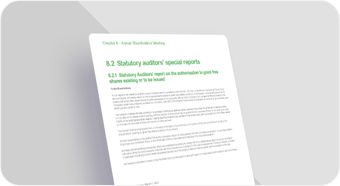 www.se.com Schneider Electric Universal Registration Document 2021 468 Chapter 8 – Annual Shareholders’ Meeting 8.2 Statutory auditors’ special reports 8.2.1 Statutory Auditors’ report on the authorization to grant free shares existing or to be issued To the Shareholders, In our capacity as statutory auditors of your company and in compliance with Article L. 225-197-1 of the French Commercial Code ( Code de commerce ), we hereby report on the proposed authorization to grant free shares, existing or to be issued, to the beneficiaries that the board of directors shall determine among the employees or the corporate officers of the Company or of companies that are related to the Company under the conditions provided for in Article L. 225-197-2 of the French Commercial Code ( Code de commerce ), an operation upon which you are called to vote. The number of shares already existing or to be issued that may be granted cannot represent more than 2% of the share capital existing on the date of this shareholders’ meeting, with the number of shares that may be granted to the corporate officers not exceeding annually 0.03% of the existing total share capital, it being specified that the total number of shares allocated cannot exceed 10% of the share capital on the date of the board of director’s decision to allocate them. Your board of directors proposes that, on the basis of its report, it be authorized, for a period of thirty-six months from the date of this shareholders’ meeting, to grant free shares existing or to be issued. It is the responsibility of the board of directors to prepare a report on this operation with which it wishes to proceed. It is our responsibility to give you our comments, if any, on the information that you have been provided about the proposed operation. We have performed those procedures which we considered necessary to comply with the professional guidance issued by the French national auditing body ( Compagnie Nationale des Commissaires aux Comptes ) for this type of engagement. These procedures consisted in particular in verifying that the methods planned and set out in the board of directors’ report comply with the provisions of the law. We have no comments to make on the information set out in the board of director’s report on the proposed authorization to grant free shares. Paris-La Défense, March 11, 2022 The Statutory Auditors French original signed by MAZARS ERNST & YOUNG et Autres Loïc Wallaert Mathieu Mougard Alexandre Resten
