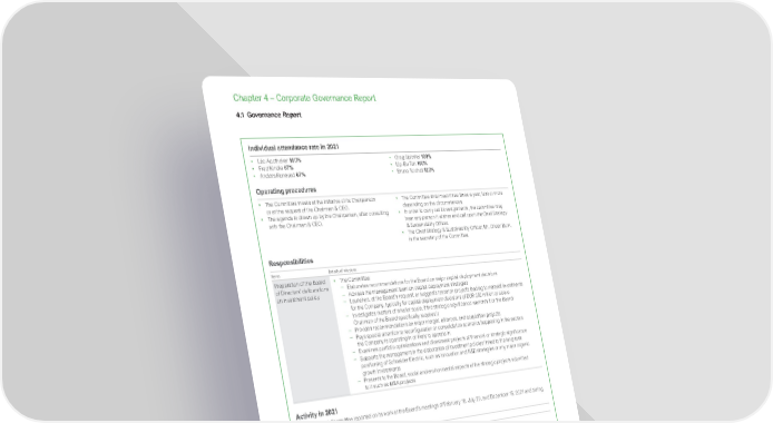 www.se.com Schneider Electric Universal Registration Document 2021 306 Chapter 4 – Corporate Governance Report 4.1 Governance Report Individual attendance rate in 2021 • Léo Apotheker 100% • Fred Kindle 67% • Anders Runevad 67% • Greg Spierkel 100% • Lip-Bu Tan 100% • Bruno Turchet 100% Operating procedures • The Committee meets at the initiative of its Chairperson or at the request of the Chairman & CEO. • The agenda is drawn up by the Chairperson, after consulting with the Chairman & CEO. • The Committee shall meet three times a year, less or more depending on the circumstances. • In order to carry out its assignments, the committee may hear any person it wishes and call upon the Chief Strategy & Sustainability Officer. • The Chief Strategy & Sustainability Officer, Mr. Olivier Blum, is the secretary of the Committee. Responsibilities Items Details of missions Preparation of the Board of Directors’ deliberations on investment policy • The Committee: − Elaborates recommendations for the Board on major capital deployment decisions − Advises the management team on capital deployment strategies − Launches, at the Board’s request, or suggests research projects leading to material investments for the Company, typically for capital deployment decisions of EUR 250 million or above − Investigates matters of smaller scale, if the strategic significance warrants it or the Board/ Chairman of the Board specifically requires it − Provides recommendations on major merger, alliances, and acquisition projects − Pays special attention to reconfiguration or consolidation scenarios happening in the sectors the Company is operating in or likely to operate in − Examines portfolio optimizations and divestment projects of financial or strategic significance − Supports the management in the elaboration of investment policies linked to the long-term positioning of Schneider Electric, such as innovation and R&D strategies or any major organic growth investments − Presents to the Board, social and environmental aspects of the strategic projects submitted to it such as M&A projects Activity in 2021 The Investment Committee reported on its work at the Board’s meetings of February 10, July 29, and December 15, 2021 and during the Strategy session. Items Details of missions Proposals to the Board of Directors • Follow-up of investment projects and opportunities • Strategic minority investment in Uplight • Acquisition of Qmerit, squeeze-out of RIB’s minority shareholders and merger with IGE+XAO • Portfolio review 4.1.4.5 Digital Committee 5 5 75% 100% meetings in 2021* members of independent Directors** average attendance rate Composition as of December 31, 2021 The Board of Directors’ internal regulations and procedures provide that the Digital Committee must have at least three members. • Greg Spierkel Chairman Independent • Léo Apotheker Member Non-independent • Xiaoyun Ma Member since February 10, 2021 Employee Director • Fleur Pellerin Member Independent • Lip - Bu Tan Member Independent * Including the joint meeting with the Audit & Risks Committee relating to cybersecurity risk review. ** Employee Directors excluded as prescribed by the AFEP-MEDEF Corporate Governance Code.