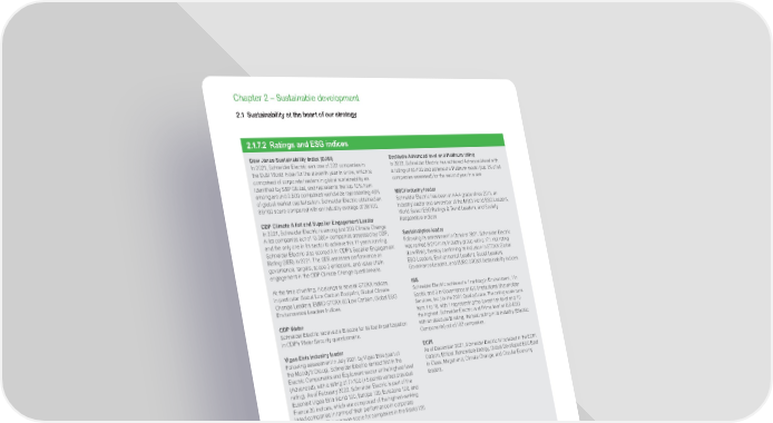 www.se.com Schneider Electric Universal Registration Document 2021 90 Chapter 2 – Sustainable development 2.1.7.2 Ratings and ESG indices Dow Jones Sustainability Index (DJSI) In 2021, Schneider Electric was one of 322 companies in the DJSI World Index for the eleventh year in a row, which is comprised of corporate leaders in global sustainability as identified by S&P Global, and represents the top 10% from among around 2,500 companies worldwide representing 45% of global market capitalization. Schneider Electric obtained an 86/100 score compared with an industry average of 28/100. CDP Climate A list and Supplier Engagement Leader In 2021, Schneider Electric is among just 200 Climate Change A list companies out of 13,000+ companies assessed by CDP, and the only one in its sector to achieve this 11 years running. Schneider Electric also scored A in CDP’s Supplier Engagement Rating (SER) in 2021. The SER assesses performance on governance, targets, scope 3 emissions, and value chain engagement in the CDP Climate Change questionnaire. At the time of writing, it belongs to several STOXX indices, in particular Global Low Carbon Footprint, Global Climate Change Leaders, EURO STOXX 50 Low Carbon, Global ESG Environmental Leaders indices. CDP Water Schneider Electric received a B score for its fourth participation in CDP’s Water Security questionnaire. Vigeo Eiris industry leader Following assessment in July 2021 by Vigeo Eiris (part of the Moody’s Group), Schneider Electric ranked first in the Electric Components and Equipment sector at the highest level (Advanced), with a rating of 71/100 (+5 points versus previous rating). As of February 2022, Schneider Electric is part of the Euronext Vigeo Eiris World 120, Europe 120, Eurozone 120, and France 20 indices, which are composed of the highest-ranking listed companies in terms of their performance in corporate responsibility. The average score for companies in the World 120 is 58/100. FTSE4Good Schneider Electric is part of the FTSE4Good Developed, FTSE Environmental Opportunities, and FTSE EO Energy Efficiency indices. EcoVadis Advanced level and Platinum rating In 2022, Schneider Electric has achieved Advanced level with a rating of 82/100 and obtained a Platinum medal (top 1% of all companies assessed) for the second year in a row MSCI industry leader Schneider Electric has been at AAA grade since 2011, an industry leader and a member of the MSCI World ESG Leaders, World Select ESG Ratings & Trend Leaders, and Socially Responsible indices Sustainalytics leader Following its assessment in October 2021, Schneider Electric was ranked 8/210 in its industry group with a 17.1 risk rating (Low Risk), thereby confirming its inclusion in STOXX Global ESG Leaders, Environmental Leaders, Social Leaders, Governance Leaders, and EURO STOXX Sustainability indices. ISS Schneider Electric achieved a 1 ranking in Environment, 1 in Social, and 3 in Governance at ISS (Institutional Shareholder Services, Inc.) in the 2021 QualityScore. The rating scale runs from 1 to 10, with 1 representing the lowest risk level and 10 the highest. Schneider Electric is at Prime level at ISS-ESG with an absolute B rating, the best rating in its industry (Electric Components) out of 182 companies. ECPI As of December 2021, Schneider Electric is included in the ECPI Carbon, Ethical, Renewable Energy, Global Developed ESG Best in Class, Megatrend, Climate Change, and Circular Economy leaders. Sustainability external ratings DJSI CDP Climate Change Vigeo Eiris EcoVadis MSCI ESG Ratings Sustainalytics 2021 Schneider score 86/100 A 71/10 0 82/100 AAA 17.1 Industry average score 28/100 B- 39/100 45/100 BB 29 Progress vs. 2020 -2 pts same +5 pts same same same Highlights 11 th year in world index 11 th year in A List World 120 and Europe 120 Indices Platinum medal AAA for eleventh year Low risk Assessed universe (# companies) 2,500 13,000 5,000+ 90,000 8,500 14,000 2.1 Sustainability at the heart of our strategy