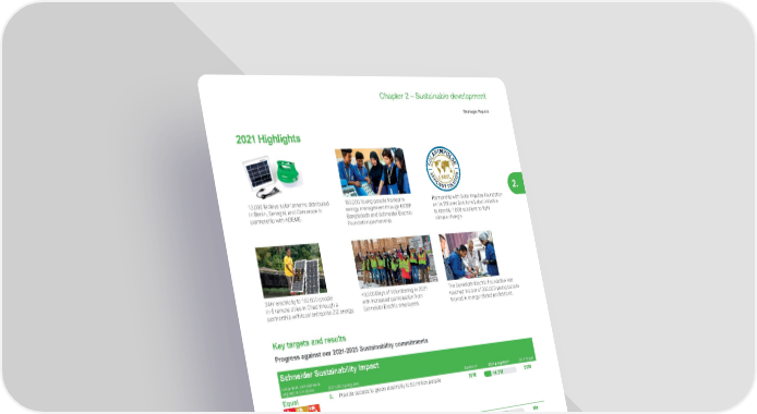 189 Life Is On | Schneider Electric www.se.com Chapter 2 – Sustainable development Strategic Report 2. 2021 Highlights 13,000 Mobiya solar lanterns distributed in Benin, Senegal, and Cameroon in partnership with ADEME. 150,000 Young people trained in energy management through UCEP Bangladesh and Schneider Electric Foundation partnership. Partnership with Solar Impulse Foundation on its Efficient Solutions Label initiative to identify 1,000 solutions to fight climate change. 24hr electricity to 150,000 people in 5 remote cities in Chad through a partnership with local entreprise ZIZ energy. +9,500 Days of Volunteering in 2021 with increased participation from Schneider Electric employees. The Schneider Electric Foundation has reached the bar of 300,000 young people trained in energy related professions. Key targets and results Progress against our 2021-2025 Sustainability commitments Schneider Sustainability Impact Long-term commitments aligned to UN SDGs 2021-2025 programs Baseline (1) 2021 progress (2) 2025 Target Equal 9. Provide access to green electricity to 50 million people 30M 0 100 +4.2M 50M Generations 11. Train people in energy management 281,737 0 100 328,359 1M Schneider Sustainability Essentials Long-term commitments aligned to UN SDGs 2021-2025 programs Baseline (1) 2021 progress (2) 2025 Target Local 25. Increase the number of volunteering days since 2017 18,469 27,981 50,000 (1) Generally, the 2020 performance serves as a baseline for Schneider Sustainability Impact (SSI) and Schneider Sustainability Essentials (SSE) programs, except SSI #1, SSI #10, SSE #5, SSE #14, and SSE #20, which are measured against a 2019 baseline to mitigate COVID-19 impacts. (2) Each year, Schneider Electric obtains a “limited” level of assurance on methodology and progress from an independent third party verifier for all the SSI and SSE indicators (except SSI #6, SSI #7, SSI #+1, SSE #12 and SSE #23, in 2021), in accordance with ISAE 3000 assurance standard (see Independent verifier’s report on page 224. Please refer to page 206 for the methodological presentation of each indicator. The 2021 performance is also discussed in more details in each section of this report. Long term roadmap 2030 Give access to green electricity to 100 million people cumulated since the beginning of the program in 2009