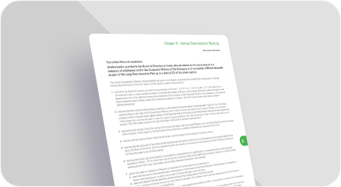 459 Life Is On | Schneider Electric www.se.com Chapter 8 – Annual Shareholders’ Meeting Shareholder Information 8. Text of the fifteenth resolution (Authorization granted to the Board of Directors to freely allocate shares to the employees or to a category of employees and/or the Corporate Officers of the Company or of companies affiliated therewith as part of the Long-Term Incentive Plan up to a limit of 2% of the share capital) The Annual Shareholders’ Meeting, having satisfied the quorum and majority requirements for extraordinary shareholders’ meetings, having heard the Board of Directors’ report and the statutory auditors’ special report: 1. authorizes the Board of Directors, pursuant to the provisions of Articles L. 225-197-1 to L. 225-197-5 and L. 22-10-59 of the French Commercial Code, on one or several occasions, to allocate free shares, existing or to be created (other than preferred shares), to the beneficiaries that it shall determine among the employees of the Company or the Corporate Officers of the Company or of companies that are related to the Company under the conditions provided for in Article L. 225-197-2 of said Code under in the conditions defined hereinafter; 2. resolves that the number of shares already existing or to be issued by this authorization cannot represent more than 2% of the share capital existing on the date of this Shareholders’ Meeting, the number of shares allocated to the Corporate Officers cannot exceed annually 0.03% of the total share capital existing, further specified that (i) this ceiling is set without taking into account any adjustments of the shares that could be allocated in case of Company’s equity operations and, that (ii) the total number of shares allocated cannot exceed 10% of the share capital on the date of the Board of Director’s decision to allocate them; 3. resolves that the entirety of the final vesting of the shares allocated to the Corporate Officers and to members of the Executive Committee of the Company will be subject to the attainment of the performance conditions determined by the Board of Directors; 4. resolves that the grant of shares to their beneficiairies could be subject to the holding of Company’s shares; 5. resolves that the allocation of the shares to their beneficiaries will be final at the term of a vesting period, the duration of which will be set by the Board of Directors, with the understanding that this duration cannot be less than two years and that the Board of Directors will have the power to set a holding period; 6. resolves that in the case of the disability of a beneficiary corresponding to a classification in the second or third of the categories specified in Article L. 341-4 of the French Social Security Code, the shares will be definitively allocated to them prior to the end of the vesting period (in this case, said shares may be freely disposed starting from their delivery); 7. grants full powers to the Board of Directors to implement this authorization and, in particular, to: a. determine the identity of the beneficiaries of the allocation of the shares among the employees of the Company or companies or above-mentioned groups, as well as the number of shares allocated to each of them, b. determine whether the allocated free shares are shares that already exist or that will be issued, c. set the conditions of performance and/or the criteria for allocation of the shares, in particular the vesting period and the minimum holding period required for each beneficiary, d. for the issuance of new shares, as the case may be, charge against any reserves, profits, or issue premiums, the amounts necessary to release said shares, e. register the free allocated shares on a registered share account in the name of their owner, stating the vesting period and its duration, f. carry out, if it deems necessary, to adjustments of the number of free allocated shares to preserve the rights of the beneficiairies depending on the potential Company’s equity operations occurred during the vesting period as specified in Article L. 225-181 paragraph 2 of the French Commercial Code, under the conditions that it will set, e. and more generally, set the dates of entitlement to dividends from the new shares, record the completion of the capital increase, amend the by-laws as necessary, to carry out any procedures necessary for the issuance, listing and any financial service related to the securities issued by virtue of this resolution and do everything useful and necessary pursuant to all applicable laws and regulations; 8. acknowledges that, in the event that the Board of Directors makes use of this authorization, it will inform the Ordinary Shareholders Meeting, each year, of the transactions thus made pursuant to the requirements of Article L. 225-197-4 of the French Commercial Code; 9. acknowledges that this delegation of authority legally implies, for the beneficiaries of the free shares, waiver of preferential subscription rights in the case of the issuance of new shares. This authorization (i) supersedes, for the portion not yet used, the authorization granted by the Combined Shareholders’ Meeting of April 25, 2019 in its 21 st resolution and (ii) is granted for a period of thirty-six (36) months from today.