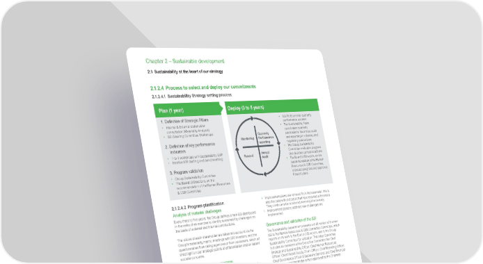 www.se.com Schneider Electric Universal Registration Document 2021 66 Chapter 2 – Sustainable development 2.1 Sustainability at the heart of our strategy 2.1.2.4 Process to select and deploy our commitments 2.1.2.4.1 Sustainability Strategy setting process Plan (1 year) Deploy (3 to 5 years) 1. Definition of Strategic Pillars • Internal & External stakeholder consultation (Materiality Analysis) • SSI Steering Committee Workshops 2. Definition of key performance indicators • 1-to-1 workshops with Sustainability SVP • Iterative KPI drafting and benchmarking 3. Program validation • Group Sustainability Committee • The Board of Directors, on the recommendation of the Human Resources & CSR Committee Quarterly Performance reporting Reward Monitoring Annual Audit • SSI Pilots provide quarterly performance updates • The Sustainability Team coordinates quarterly publications, the annual audit and reporting in voluntary and regulatory publications • The Group Sustainability Committee evaluates progress and decides corrective actions • The Board of Directors, on the recommendation of the Human Resources & CSR Committee, oversees progress and approves Reward plans 2.1.2.4.2 Program planification Analysis of material challenges Every three to five years, the Group defines a new SSI dashboard in the wake of an exercise to identify sustainability challenges on the basis of external and internal contributions. The voices of each stakeholder are taken into account via the Group’s materiality matrix, meetings with SRI investors, and the questionnaires from rating agencies or from customers, which all shed light on our strategic points of differentiation and on salient societal concerns. Definition of disruptive programs For each target and indicator, and this is a critical point for the operational implementation of each SSI, the ambition is defined in consultation with the departments concerned. In 2020, a specific SSI Steering Committee was created, with about 50 members: representants of each Executive Committee member, each geography, function, and business unit. Three all- hands workshops took place, and the sustainability team organized individual follow up interviews with each member to define precise and measurable programs. For the Group, it is a guarantee of strong mobilization in the field that is consistent with actual priorities; for teams, it is the assurance of having the necessary means and visibility to improve. In each new period, the barometer update takes into account results obtained, progress still expected, the emergence of new topics and new priorities, and the experience gained. Thus, it is a powerful tool to move the Group forward on its major challenges. Four scenarios may emerge from one SSI to the next: • Improvement plans are maintained in the barometer and their targets are renewed or increased. • Improvement plans change: new and more innovative or better-adapted indicators that cover the same subject are implemented; old indicators continue to be monitored internally if necessary. • Improvement plans are removed from the barometer; this is also the case with indicators that have reached a threshold. They continue to be monitored internally if necessary. • Improvement plans to address new challenges are implemented. Governance and validation of the SSI The Sustainability department presents a draft version of the new SSI to the Human Resources & CSR Committee Committee, which reports on its work to the Board of Directors, and to the Group Sustainability Committee for validation. This latter Committee includes six members of the Executive Committee: the Chief Strategy and Sustainability Officer; Chief Human Resources Officer; Chief Global Supply Chain Officer; Chief Marketing Officer; Chief Governance Officer & Secretary General; and Chief Financial Officer. The new barometer is then approved by the Chairman & CEO. 2.1.2.4.3 Program deployment Transparent quarterly and annual disclosure Quarterly results are supervised by the Group Sustainability Committee, which makes decisions on any corrective actions that may be necessary to reach objectives. This Committee meets quarterly. The Human Resources & CSR Committee within the Board of Directors conducts an annual review of the Group’s Sustainability Policy, analyzing, in particular, the performance of the SSI. Extra-financial annual results are presented together with financial results by Jean-Pascal Tricoire, Chairman & CEO of Schneider Electric, in order to demonstrate the Group’s commitment to making sustainability part of the Company’s long-term strategy. In addition, since 2014, quarterly results have been presented together with quarterly financial information to institutional investors by the Chief Finance Officer.
