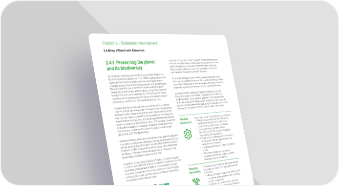 www.se.com Schneider Electric Universal Registration Document 2021 146 Chapter 2 – Sustainable development 2.4 Being efficient with Resources 2.4.1 Preserving the planet and its biodiversity According to the Intergovernmental Science-Policy Platform on Biodiversity and Ecosystem Services (IPBES) global assessment report, biodiversity loss is unsustainable, and transformative changes are required to safeguard economic and social models. Major biodiversity loss undermines nature’s ability to support people and communities, a factor which strongly improves both quality of life and business prosperity. The fight against nature loss should be a business priority: nature is essential to global economic prosperity and individual business success. A sustainable future for people and economies will be possible if nature, climate, and people are addressed in an integrated way. Indeed, climate change is among the main drivers of biodiversity loss, and yet nature is part of the climate solutions. To engage in a transformative change, clear and measurable international targets, meaning counterparts to both the 1.5°C – 2°C increase climate limit and its associated carbon budget, must be defined. Schneider Electric supports the creation of ambitious biodiversity targets during the COP15 for Biodiversity. Schneider Electric calls for all companies to fast-track the adoption of ambitious biodiversity strategies, leveraging best practices from climate Science-Based Targets. In a joint effort with Marc Abadie, Chairman of CDC Biodiversité and Eva Zabey, CEO of Business for Nature, Schneider invites all companies to “raise corporate biodiversity ambition and aim at no net loss”. In addition to improving resource efficiency, it is also necessary in order to live within the limits of our planet to transform industrial processes and business models to move towards a circular economy. Circular economy is an obsession to avoid wastage and to reuse, repair, retrofit or recycle materials, maximizing environmental and financial value. A circular mindset also triggers process innovations and opens the door to new business models, enhancing customer intimacy and thus loyalty (e.g. take-back and modernization services). High hopes are placed on circularity as a state of mind, as it can transform multiple industries for the better. From a risk standpoint, some challenges may arise from a lack of stringent regulations or uncontrolled practices if used products come back into the loop without adequate controls and expertise, especially regarding life-critical products and electrical safety. Schneider Electric embraces circular principles all along the lifecycle of products and offers. The keystone of circularity is EcoDesignWay ™ , a process that is applied to the development of all new products. EcoDesignWay ™ enables the right trade-offs between the environmental impact along the lifecycle of products, allowing to coordinate the efforts over the whole value chain. Product innovation On product design, Schneider has committed to: • Phase-out potentially harmful substances and provide transparent information on environmental performance of products • Design with a circular mindset with Green Premium ™ , for increased durability, repairability and recyclability • Provide public and transparent information for the proper dismantling and end-of-life management of products • Increase green material content in products to 50% • 100% of its primary and secondary packaging is free from single-use plastic and uses recycled cardboard Process innovation In the manufacturing phase, the Group applies circularity principles in its operations and with customers: • Have 200 ‘Waste-to-Resource’ sites by 2025 to optimise waste generation and recycling on the Group’s sites • EcoStruxure ™ solutions help customers improve resource efficiency in industrial processes Business model innovation Over the lifecycle of offers, Schneider commits to innovate with circular business models and services: • Support customers to optimise asset lifecycle management for increased durability and efficiency, with Asset Performance Management (APM) services • Give a second life to products (unsold or obsolete stock, commercial returns), with the ‘circular certified’ label launched in France in 2020 • For specific product ranges such as products containing SF 6 , offer take-back and end- of-life management services. The Group is committed to avoid 420,000 metric tons of primary resource consumption through ‘take-back at end-of-use’ from 2017 to 2025