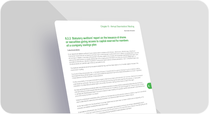 469 Life Is On | Schneider Electric www.se.com Chapter 8 – Annual Shareholders’ Meeting Shareholder Information 8. 8.2.2 Statutory auditors’ report on the issuance of shares or securities giving access to capital reserved for members of a company savings plan To the Shareholders, In our capacity as statutory auditors of your company and in compliance with Articles L. 228-92 and L. 225-135 et seq. of the French Commercial Code ( Code de commerce ), we hereby report on the proposal to authorize the board of directors to decide whether to proceed with an issue of shares or securities giving access to the share capital of the company with cancellation of preferential subscription rights, reserved for participants in a company savings plan of the company and of the French or non-French companies affiliated with it, in accordance with article L. 225-180 of the French Commercial Code ( Code de commerce ) and article L. 3344-1 of the French Labor code ( Code du travail ), an operation upon which you are called to vote. The maximum nominal amount of the increase in capital that may result from these issues is 2 % of the share capital on the date of this shareholders’ meeting. Your board of directors proposes that, on the basis of its report, it be authorized for a period of twenty-six months, to decide on whether to proceed with issues and proposes to cancel your preferential subscription rights to the shares and securities to be issued. If applicable, it shall determine the final conditions of these operations. It is the responsibility of the board of directors to prepare a report in accordance with articles R. 225-113 et seq. of the French Commercial code ( Code de commerce ). Our role is to report on the fairness of the financial information taken from the accounts, on the proposed cancellation of preferential subscription rights, and on other information relating to these issues provided in this report. We have performed those procedures which we considered necessary to comply with the professional guidance issued by the French national auditing body ( Compagnie Nationale des Commissaires aux Comptes ) for this type of engagement. These procedures consisted in verifying the information provided in the board of director’s report relating to this operation and the methods used to determine the issue price of the equity securities to be issued. Subject to a subsequent examination of the conditions for the issues that would be decided, we have no matters to report as to the methods used to determine the issue price of the equity securities to be issued provided in the board of director’s report. As the final conditions for the issues have not yet been determined, we cannot report on these conditions and, consequently, on the proposed cancellation of preferential subscription rights. In accordance with article R. 225-116 of the French Commercial Code ( Code de commerce ), we will issue a supplementary report, if necessary, when your board of directors has exercised this authorization, in the event of the issue of shares or securities giving access to other equity securities and of the issue of securities giving access to equity securities to be issued. Paris-La Défense, March 11, 2022 The Statutory Auditors French original signed by MAZARS ERNST & YOUNG et Autres Loïc Wallaert Mathieu Mougard Alexandre Resten