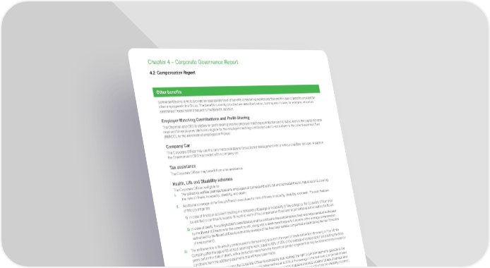 www.se.com Schneider Electric Universal Registration Document 2021 332 Chapter 4 – Corporate Governance Report Other benefits Schneider Electric aims to provide an appropriate level of benefits considering market practice and the level of benefits provided for other employees in the Group. The benefits currently provided are described below, but may also include, for example, relocation assistance if required and subject to the Board’s decision. Employer Matching Contributions and Profit-Sharing The Chairman and CEO is eligible for profit-sharing and the employer matching contribution paid to subscribers to the capital increase reserved for employees. He is also eligible for the employer matching contribution paid to subscribers to the collective pension fund (PERCO), for the retirement of employees in France. Company Car The Corporate Officer may use the cars made available to Group Senior Management with or without chauffeur services. In addition, the Chairman and CEO is provided with a company car. Tax assistance The Corporate Officer may benefit from a tax assistance. Health, Life and Disability schemes The Corporate Officer is eligible for: i. The collective welfare plan applicable to employees of Schneider Electric SE and Schneider Electric Industries SAS covering the risks of illness, incapacity, disability, and death; ii. Additional coverage of the Group’s French executives for risks of illness, incapacity, disability, and death. The main features of this coverage are: 1) In case of illness or accident resulting in a temporary stoppage or incapacity (of any category), the Corporate Officer shall be entitled to continue to receive 18 months’ worth of his compensation (fixed and target variable) authorized by the Board, 2) In case of death, the policyholder’s beneficiaries shall be entitled to the compensation (fixed and target variable) authorized by the Board of Directors for the current month, along with a death benefit equal to 6 months of the average compensation authorized by the Board of Directors (monthly average of the fixed and variable compensation paid during the last 12 months of employment); iii. The entitlement to a life annuity pension paid to the surviving spouse in the event of death before his retirement, or if he left the Company after the age of 55 without returning to work, equal to 60% of 25% of the average of compensation paid during the three years before the date of death, with a deduction made from the theoretical pension payment that may be obtained under insurance conditions from the additional payments that will have been made; iv. In the event of disability causing the Corporate Officer to completely stop working, the right to pension payments (payable to the surviving spouse at a rate of 60%) beginning from his retirement equal to 25% of the average of the total cash compensation paid over the three years preceding the date of disability minus 1.25% per quarter of absence so as to obtain a full rate of pension and minus the amount of additional compensation that may be obtained under insurance conditions at the time the disability occurred; v. In the event of an accident, the Group insurance covering the executive’s accident risk, stipulating the payment of a benefit the sum of which may be up to four times the annual compensation based on the type and circumstances of the accident. Eligibility for benefits (ii) through (v) above is conditional on the fulfilment of one of the following conditions: • the average of the net income of the last five fiscal years preceding the event is positive; • the average of the free cash flow of the last five fiscal years preceding the event is positive. Director’s fee The Chairman and CEO has waived the attendance fees to which he is entitled in his capacity of Board member. Extraordinary awards The Compensation policy does not include any provisions for extraordinary payments. The Board decided to maintain the prohibition of one-off payments that are not provided for in the compensation policy approved by the shareholders. 4.2 Compensation Report