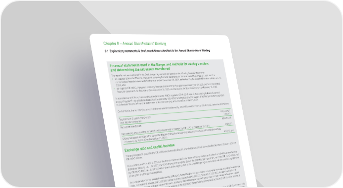 www.se.com Schneider Electric Universal Registration Document 2021 464 Chapter 8 – Annual Shareholders’ Meeting Financial statements used in the Merger and methods for valuing transfers and determining the net assets transferred The transfer values mentioned in the Draft Merger Agreement are based on the following financial statements: • as regards Schneider Electric, the parent company financial statements for the year ended December 31, 2021 and the consolidated financial statements for the year ended December 31, 2021, as finalized by the Board of Directors on February 16, 2022; and • as regards IGE+XAO, the parent company financial statements for the year ended December 31, 2021 and the consolidated financial statements for the year ended December 31, 2021, as finalized by the Board of Directors on February 16, 2022. In accordance with French accounting standard-setter ANC’s regulation 2014-03 of June 5, 2014 relating to France’s general accounting plan (5) , the assets and liabilities transferred by IGE+XAO to Schneider Electric as part of the Merger will be recognized in Schneider Electric’s financial statements at their net carrying amounts at December 31, 2021. On that basis, the net carrying amount of the net assets transferred by IGE+XAO would amount to €38,693,042, determined as follows: Total amount of assets transferred: €39,650,407 Total liabilities assumed: € 3 9 9 ,112 Net assets transferred: €39,251,295 Net carrying amount of the 4,434 IGE+XAO shares held in treasury by IGE+XAO at December 31, 2021: €558,253 Giving net assets transferred to Schneider Electric (minus the net carrying amount of the 4,434 IGE+XAO shares held in treasury by IGE+XAO at December 31, 2021): €38,693,042 Exchange ratio and capital increase The exchange ratio proposed to IGE+XAO and Schneider Electric shareholders is 5 (five) Schneider Electric shares for every 3 (three) IGE+XAO shares. In accordance with Article L. 236-3 of the French Commercial Code, there will be no exchange of either the IGE+XAO shares held by Schneider Electric, i.e., 1,094,733 IGE+XAO shares at the signing date of the Draft Merger Agreement, nor of the IGE+XAO shares held by IGE+XAO itself, i.e., 4,434 IGE+XAO shares at the signing date of the Draft Merger Agreement, which will be canceled by operation of law after the Merger is completed. In consideration for the assets transferred by IGE+XAO, Schneider Electric would carry out a capital increase, applying the exchange ratio, in a nominal amount of €1,368,092, taking its share capital from €2,276,133,768 to €2,277,501,860, through the creation of 342,023 new shares, with par value of €4 each, allotted to IGE+XAO shareholders in proportion to their interest in the share capital, with the exception of Schneider Electric (in respect of the IGE+XAO shares held by Schneider Electric) and IGE+XAO (in respect of the IGE+XAO shares held by IGE+XAO itself). However, it is provided in Article 7.2 of the Draft Merger Agreement that in the event of a change in the number of IGE+XAO shares held by Schneider Electric and/or in the number of shares comprising the share capital of Schneider Electric that may impact the exchange ratio, the number of Schneider Electric shares to be issued in consideration for the Merger and, correlatively, the nominal amount of the resulting share capital increase would be automatically adjusted accordingly. Thus, in view of the adjustment related to the acquisition by SEISAS of 34,629 IGE+XAO shares after the signing date of the Draft Merger Agreement, the amount of the capital increase would amount, as of February 28, 2022, to €1,137,232 (i.e., 284,308 newly issued Schneider Electric shares) and the amount of the merger premium would amount to €3,940,246 and to €260,018,556 for the merger loss. The final amounts will be communicated on the date of the combined shareholders’ meeting. Following this capital increase and on the basis of information available to the Company, the distribution of capital would be, as of February 28, 2022, as follows: Shareholder Before the capital increase resulting from the Merger After the capital increase resulting from the Merger (resolution #18) (resolution #18) Number of shares % of capital Number of shares % of capital Free Float 460,869,416 80.992% 460,869,416 8 0.9 51% Sun Life Financial, Inc. 39,681,766 6 . 974% 39,681,766 6.970% Blackrock, Inc. 35,703,751 6 . 274% 35,703,751 6.271% Employees 20,321,627 3.571% 20,321,627 3.569% Group-owned stock 12,456,882 2.18 9 % 12,456,882 2.18 8 % Former shareholders of IGE+XAO 0 0.000% 284,308 0.045% Total 569,033,442 100% 569,317,750 100% (5) As amended, particularly by regulation no. 2017-01 of May 5, 2017 and regulation no. 2019-06 of November 8, 2019. 8.1 Explanatory comments & draft resolutions submitted to the Annual Shareholders’ Meeting