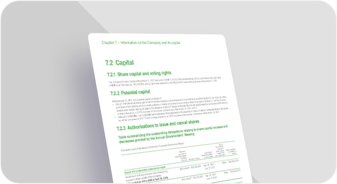 www.se.com Schneider Electric Universal Registration Document 2021 436 Chapter 7 – Information on the Company and its capital 7.2 Capital 7.2.1 Share capital and voting rights The Company’s share capital at December 31, 2021 amounted to EUR 2,276,133,768 represented by 569,033,442 shares with a par value of EUR 4, all fully paid up. 595,320,658 voting rights were attached to the 569,033,442 outstanding shares as at December 31, 2021. 7.2.2 Potential capital At December 31, 2021, the potential capital consisted of: • 293,071 Performance shares part of which remains subject to the achievement of performance conditions (plans 32, 34, 37 bis , 38, 39 bis and 39 ter which delivery either in existing shares or shares to be issued have not been determined yet by the Board). If all Performance Shares were vested, this would lead to the issuance of 293,071 shares. Schneider Electric SE capital would be composed of 569,326,513 ordinary shares i.e. a 0.05% increase of the number of shares as of December 31, 2021; and of • 3,683,972 OCEANEs. If all OCEANEs were exercised, this would lead to the issuance of 3,683,972 shares. Schneider Electric SE capital would be composed of 572,717,414 ordinary shares i.e. a 0.65% increase of the number of shares as of December 31, 2021. 7.2.3 Authorizations to issue and cancel shares Table summarizing the outstanding delegations relating to share capital increase and decreases granted by the Annual Shareholders’ Meeting This table is part of the Board of Directors’ Corporate Governance Report. Maximum par value of authorized capital increases (in euros) Number of shares Authorization date/authorization expiration date Use of the resolution (number of shares whose issuance has been authorized) Amount available (in number of shares) Issues with preferential subscription rights Issuance of ordinary shares or securities giving access to share capital of the Company (16 th resolution of the AGM of April 28, 2021) 800 million (1) 200,000,000 Apr. 28, 2021/ Jun. 27, 2023 None 200,000,000 (3) Capitalizing additional paid-in capital, reserves or earnings other (21 st resolution of the AGM of April 28, 2021) 800 million (1) 200,000,000 Apr. 28, 2021/ Jun. 27, 2023 None 200,000,000 (3) Issues without preferential subscription rights Issuance, in cash or in compensation of listed securities, shares or other securities giving access immediately or in the future to the capital (17 th resolution of the AGM of April 28, 2021) 224 million (1)(2) 56,000,000 Apr. 28, 2021/ Jun. 27, 2023 None 56,000,000 (3) Issuance of shares and other securities through an offer referred to in Article L. 411-2 1° of the French Monetary and Financial Code (18 th resolution of the AGM of April 28, 2021) 120 million (1) 30,000,000 Apr. 28, 2021/ Jun. 27, 2023 None 56,000,000 Issuance of shares and other securities as consideration for unlisted securities (20 th resolution of the AGM of April 28, 2021) 224 million (1)(2) 56,000,000 Apr. 28, 2021/ Jun. 27, 2023 None 56,000,000 Overall limits on issuance made under the above resolutions 800 million (1) 200,000,000 Apr. 28, 2021/ Jun. 27, 2023 None 200,000,000 (3)