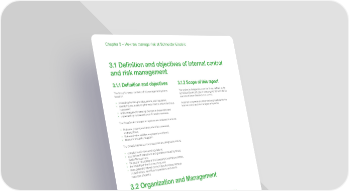www.se.com Schneider Electric Universal Registration Document 2021 244 Chapter 3 – How we manage risk at Schneider Electric 3.1 Definition and objectives of internal control and risk management 3.1.1 Definition and objectives The Group’s internal control and risk management systems focus on: • protecting the Group’s value, assets, and reputation; • identifying and measuring the major risks to which the Group is exposed; • anticipating and foreseeing changes in these risks; and • implementing risk prevention and transfer measures. The Group’s risk management systems are designed to ensure: • Risks are properly and timely identified, assessed, and prioritized; • Risks and vulnerabilities are properly monitored; • Risks are efficiently mitigated. The Group’s internal control procedures are designed to ensure: • compliance with laws and regulations; • application of instructions and guidelines issued by Group Senior Management; • the proper functioning of the Company’s internal processes; • the reliability of financial reporting; and • more generally, internal control helps the Group manage its businesses, run efficient operations, and use its resources efficiently. 3.1.2 Scope of this report The system is designed to cover the Group, defined as the Schneider Electric SE parent company and the subsidiaries over which it exercises exclusive control. Acquired companies are integrated progressively into the internal control and risk management systems. 3.2 Organization and Management 3.2.1 Group values Resilience as a top value Schneider Electric has placed significant importance on resilience within the values and principles which guide and inspire its actions and, in particular, its business practice. Indeed, resilience is one of the fundamental elements of sustainable growth and belongs directly to the Group’s Sustainability value. All Group entities, along the three lines of defense described hereafter, are encouraged to: • Develop a culture promoting resilience for the Group; • Raise resilience awareness and best practices, within their scope of work; • Implement initiatives aimed at increasing the Group resilience, by decreasing the risk exposure and/or increasing its level of preparedness. Hybrid risk management model Schneider Electric uses a hybrid risk management model. It means that there are Central functions and experts in charge of setting risk management mechanisms, establishing policies, and other activities, but that the ownership of the risks belongs to the Business Units and Operating Divisions who are responsible for deploying the central framework to manage their risks. The section hereafter (3.2.2) goes over our three lines of defense and gives more detail about our hybrid risk management model.