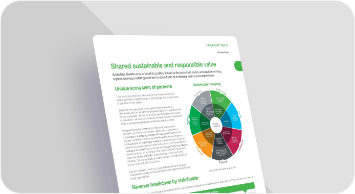 33 Life Is On | Schneider Electric www.se.com Integrated report Strategic Report Buildings, Industry, Infrastructure and Energy Non-Governmental Organizations, Media, etc. Social Partners and Bodies, UIMM, etc. Legislators, European Commission ILO, OECD, etc. Other Standardization Bodies, Teaching and Research, Independent Experts, etc. SRI, Financial and Extra-Financial Analysts, etc. Groups and Professional Unions, Consortiums, JV, etc. Local Residents and Territorial Collectivities Contractors, Integrators, OEM, Systems Manufacturers, Distributors Employees Authorities and Global Compact Standardization Bodies IEC and Product Certication Shareholders, Investors, Banks and Insurers Suppliers and Subcontractors Gimélec companies C i v i l s o c i e t y S o c i a l C u s t o m e r s P a r t n e r s F i n a n c i a l I n s t i t u t i o n a l T e c h n i c a l * Borrowings, capital increases and treasury stock disposals. (1) Of which €307 million in R&D. (2) Of which €136 million for long-term pension assets. Employees: wages €8,434 million States: income taxes €966 million Non-governmental organizations: donations €19 million Shareholders: dividends €1,447 million Bank: net bank fees €95 million Procurement and other €15,775 million Net external financing* including capital change (€1,646 million) Investments and development €817 million (1) Net financial investments €4,351 million (2) Operating Cash flow after Dividend Payment €2,169 million Change in cash (€4,645 million) 2021 Total Revenue: €28,905 million Investment capabilities R&D: €1,539 million Shared sustainable and responsible value Schneider Electric aims to boost its positive impact on the planet and society at large by promoting a green and responsible growth that is shared with all its internal and external stakeholders. Unique ecosystem of partners To share its expertise and develop high-performance solutions, Schneider Electric builds long-term partnerships with a wide range of global and local players. Schneider has developed the industry’s largest network of distributors, and works with many types of suppliers, as well as with its end customers. The Group is continually strengthening its local connections in all countries to deliver the best customer experience and co-develop sustainable and effective digital solutions. Alongside business partnerships, the Group is involved in various local or international associations and organizations supporting sustainability, working with key players from across society. Schneider confirms its commitment to and participation in discussions on challenges related to climate change. To further advance social and environmental best practice, Schneider Electric reiterates its commitment to the Ten Principles of the United Nations Global Compact on an annual basis. Since 2018, the Group has been among the 38 LEAD companies most committed to this initiative. The Group is also an active member of the Business for Inclusive Growth (B4IG) coalition. Last but not least, the Group is committed to all its employees empowering people across generations and regions and offering equal opportunities. Revenue breakdown by stakeholder Every year for the last 15 years, Schneider Electric has published a diagram showing its revenue distribution and financial flow for its various stakeholders. Source: CSR sector reporting guide, 2017. Stakeholder mapping