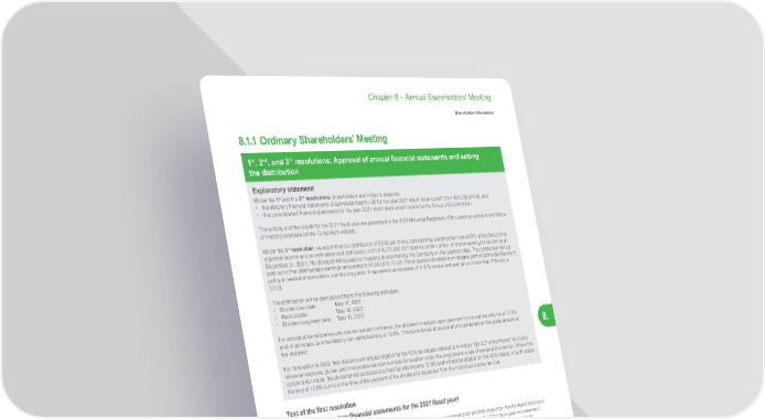 449 Life Is On | Schneider Electric www.se.com Chapter 8 – Annual Shareholders’ Meeting Shareholder Information 8. 8.1.1 Ordinary Shareholders’ Meeting 1 st , 2 nd , and 3 rd resolutions: Approval of annual financial statements and setting the distribution Explanatory statement Under the 1 st and the 2 nd resolutions , shareholders are invited to approve: • the statutory financial statements of Schneider Electric SE for the year 2021 which show a profit of €1,498,235,274.60; and • the consolidated financial statements for the year 2021 which show a net income for the Group of €3,204 million. The activity and the results for the 2021 fiscal year are presented in the 2021 Universal Registration Document as well as in the Notice of meeting available on the Company’s website. Under the 3 rd resolution , we recommend a distribution of €2.90 per share, representing a distribution rate of 47% of the Group’s net adjusted income and an estimated total distribution of €1,614,075,092.20 (1) (based on the number of shares ranking for dividends at December 31, 2021). No dividend will be paid on treasury shares held by the Company on the payment date. This distribution will be paid out of the distributable earnings amounting to €1,943,015,112.95. The proposed dividend is an integral part of Schneider Electric’s policy to reward shareholders over the long term. It represents an increase of 11.5 % versus last year (and of more than 70% since 2012). The distribution will be paid according to the following schedule: • Dividend ex-date: May 17, 2022 • Record date: May 18, 2022 • Dividend payment date: May 19, 2022 For individual beneficiaries who are tax resident in France, the dividend is subject upon payment to a social security tax of 17.2% and, in principle, to a mandatory non-definitive levy of 12.8%. This tax is levied at source and is computed on the gross amount of the dividend. For its taxation in 2023, this dividend will fully be eligible for the 40% tax rebate referred to in Article 158.3.2° of the French Tax Code where an express, global, and irrevocable election is made for taxation under the progressive scale of personal income tax. Where this option is not made, the dividend will be taxed at a final flat-rate income 12.8% and will not be eligible for this 40% rebate. In both cases, the levy of 12.8% borne at the time of the payment of the dividend is deducted from the individual income tax due. Text of the first resolution (Approval of statutory financial statements for the 2021 fiscal year) The Annual Shareholders’ Meeting, having satisfied the quorum and majority requirements for ordinary meetings, having heard the Board of Directors’ report and the statutory auditors’ report, approves the statutory financial statements for the 2021 fiscal year as presented, as well as the transactions reflected in these statements or summarized in these reports showing a net profit of €1,498,235,274.60. In addition, pursuant to Article 223 quater of the French Tax Code (Code général des impôts), the Shareholders’ Meeting approves the value of expenses and charges non-deductible from taxable result liable to corporate income tax and amounting to €2,508.02 as well as the theoretical tax borne as a result of these charges amounting to €666.89. Text of the second resolution (Approval of consolidated financial statements for the 2021 fiscal year) The Annual Shareholders’ Meeting, having satisfied the quorum and majority requirements for ordinary meetings, having heard the Board of Directors’ report and the statutory auditors’ report, approves the consolidated statements for the 2021 fiscal year as presented, as well as the transactions reflected in these statements or summarized in these reports. Text of the third resolution (Appropriation of profit for the financial year and setting the dividend) The Annual Shareholders’ Meeting, having satisfied the quorum and majority requirements for ordinary meetings, having noted that the Company’s fiscal year ending December 31, 2021 closed with a net profit of €1,498,235,274.60 and, considering the retained earnings amounted to €444,779,838.35, the distributable earnings amounted to €1,943,015,112.95, upon proposal of the Board of Directors, decides: • the distribution to the shareholders of a dividend of €2.90 per share, i.e., €1,614,075,092.20 (1) on the basis of the number of shares ranking for dividends at December 31, 2021 paid from the distributable earnings; and • the allocation of the balance of the distributable earnings after distribution to the retained earnings. (1) This amount is calculated based on the number of shares ranking for dividends at December 31, 2021 and could therefore change if this number varies between January 1, 2022 and the ex-dividend date.