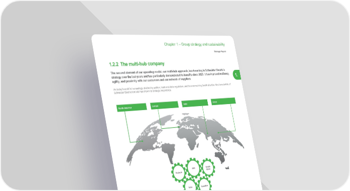 47 Life Is On | Schneider Electric www.se.com Chapter 1 – Group strategy and sustainability Strategic Report 1. 1.2.2 The multi-hub company The second element of our operating model, our multi-hub approach, has been key in Schneider Electric’s strategy over the last years and has particularly demonstrated its benefits since 2020. It has improved resiliency, agility, and proximity with our customers and our network of suppliers. As today’s world is increasingly divided by politics, trade and data regulations, and the ever-evolving health situation, this characteristic of Schneider Electric’s model has shown its strategic importance. China Europe North America India In 2021, Schneider Electric’s multi-hub strategy was reinforced and strengthened with the creation of the Indian hub, built when merging with Larsen & Toubro’s Electrical & Automation division. India is one of the most promising regions in the world for electrification, digitization, urbanization and manufacturing, and is now one of Schneider Electric’s major manufacturing and talent centers with 30,000 employees and 30 factories. Four hubs now serve the Group’s different markets (Europe, North America, China & India). Each hub has its own capabilities, while operating and contributing together toward the same Group objectives. Group objectives Products and offers are adapted locally to the specificity and standards of local markets, leveraging global R&D platforms and architectures. This is key for compliance with local standards (e.g., NEMA North America, IEC Europe, and CCC Asia Pacific), regulations (e.g., data and cybersecurity), operating conditions, and design specificities. Schneider Electric’s supply chain is organized by region, serving local customers with the support of local suppliers. As such, in 2020, 92% of Schneider’s supplied goods come from the same region as its manufacturing sites, and 80% of Schneider’s sales are produced in the same region as its customers. Schneider Electric’s suppliers are becoming increasingly local as close relationships are built with manufacturers in the region, for better flexibility and resiliency. R&D Suppliers Supply Chain Products Sales