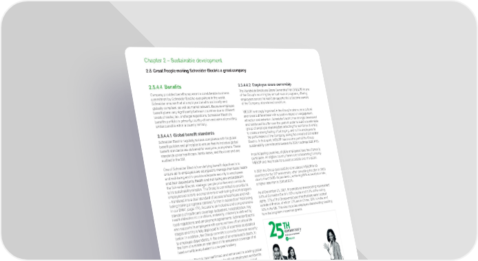 www.se.com Schneider Electric Universal Registration Document 2021 184 Chapter 2 – Sustainable development 2.5 Great People making Schneider Electric a great company 2.5.4.4 Benefits Company provided benefits represent a considerable business commitment by Schneider Electric everywhere in the world. Schneider ensures that all employee benefits are locally and globally compliant, as well as market relevant. Because employee benefit plans vary significantly between countries due to different levels of social, tax, and legal regulations, Schneider Electric’s benefits portfolio is primarily country-driven and aims at providing similar benefits within a country territory. 2.5.4.4.1 Global benefit standards Schneider Electric regularly reviews compliance with its global benefit policies and principles to ensure that its inclusive global benefit standards are delivered for everyone, everywhere. These standards cover healthcare, family leave, and life cover and are audited in the SSI. One of Schneider Electric’s underlying benefit objectives is to ensure all its employees are equipped to manage their basic health and well-being and to provide adequate security to employees and their dependents. Health and well-being are embedded in the Schneider Electric strategic people priorities and contribute to its sustainability mission. The Group is committed to provide its employees access to a comprehensive well-being at work program – translated into a dual standard of access to healthcare and well- being training programs (detailed further in subsection “Well-being in our DNA”, page 174). Access to an inclusive and comprehensive standard of healthcare coverage (outpatient, hospitalization, key health risks/chronic conditions, maternity, children) is defined by local regulations and employment agreements. Schneider Electric also supports its employees with personal time off at critical life stages and this is fully deployed in 100% of countries as detailed below. In addition, the Group commits to provide financial security to employee dependents, in the event of an employee’s death, in the form of a minimum standard of life assurance coverage of at least a multiple equivalent to one year’s salary. Schneider Electric has reaffirmed and enhanced its existing global benefit standards outlined above for all our employees worldwide, for the duration of the COVID-19 crisis. This included a global extension of care leave from one to two weeks for our employees to care for their dependents diagnosed with COVID-19. Global Family Leave Policy As part of being a caring and responsible employer, Schneider Electric launched its global family leave policy along with care leave in 2017. With its industry-leading Global Family Leave Policy, Schneider Electric supports employees with personal time at critical life stages and empowers everyone to manage their “unique life and work” so that they can be at their best. While the Group’s countries have flexibility to define eligibility and policy details per statutory/market requirements, the policy sets global minimum standards: • Fully paid parental leave (primary parent – 12 weeks, secondary parent – 2 weeks); • Care leave (for sick/elderly relatives – 1 week); and • Bereavement leave (1 week). All benefits eligible employees have access to this global policy. 2.5.4.4.2 Employee share ownership The Worldwide Employee Share Ownership Plan (WESOP) is one of the Group’s recurring key annual reward programs, offering employees across the world an opportunity to become owners of the Company, at preferred conditions. WESOP is strongly ingrained in the Group’s culture, as a cultural and reward differentiator with a positive impact on engagement, attraction and retention. Schneider Electric has strongly developed and reinforced its offer over the years in order to build a sustainable group of employee shareholders reflecting the workforce diversity, to create a strong feeling of belonging, and to link employees to the performance of the Company, acting like owners of Schneider Electric. In that spirit, WESOP has become part of the Group sustainability commitments towards its 2025 roadmap (SSE #19). In participating countries, eligible employees have the chance to participate. All eligible country teams are collaborating to deploy WESOP and they made its success possible over the years. In 2021 the Group successfully reintroduced WESOP in 40 countries for the 25 th anniversary, after cancelling the plan in 2020 due to the COVID-19 pandemic, achieving 59% subscription rate, a higher rate than in 2019 at 50%. As of December 31, 2021, the employee shareholding represented 3.6% of Schneider Electric SE’s capital and 6.3% of the voting rights. 77% of the Group employee shareholders were located outside of France, of which 13% are in China, 15% in India, and 10% in the US. This also includes employee shareholding resulting from the long-term incentives grants.