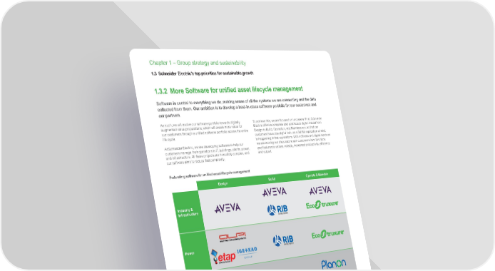 www.se.com Schneider Electric Universal Registration Document 2021 52 Chapter 1 – Group strategy and sustainability 1.3.2 More Software for unified asset lifecycle management Software is central to everything we do, making sense of all the systems we are connecting and the data collected from them. Our ambition is to develop a best-in-class software portfolio for our customers and our partners. As such, we will evolve our software portfolio towards digitally augmented value propositions, which will create more value for our customers through a unified software portfolio across the entire life cycle. At Schneider Electric, we are developing software to help our customers manage their operations in IT, buildings, plants, power, and infrastructure. All these projects are incredibly complex, and our software aims to reduce that complexity. To achieve this, we are focused on two areas. First, Schneider Electric offers a complete and continuous digital thread from Design to Build, Operation, and Maintenance, so that our customers have one digital twin, as a faithful replication of what is happening in their operations. With software and digital services we are moving our discussions with customers from functions and features to values, notably, increased productivity, efficiency and output. Federating software for unified asset lifecycle management Design Build Operate & Maintain Industry & Infrastructure Power Building Partnerships Second, our customers’ projects cover several integrated domains: Industry and Infrastructure, Power, and Building. Our customers own factories and buildings, requiring power distribution for both. They expect Schneider’s software portfolio to stretch across these domains and unify their approach. Our software portfolio made up of Schneider, AVEVA/OSIsoft, RIB Software, ETAP, ALPI, and Planon puts us in a position to have broad coverage along the entire asset life cycle and a clear market- leading position, when it comes to data platforms in Operate and Maintain phases. This software interfaces with the physical world through EcoStruxure ™ , through IoT, offering our customers unified user experience and asset lifecycle management for their projects and operations. In 2021, Schneider completed the following transactions to build a unified software federation. • ETAP Automation Inc. in June 2021 • OSIsoft in March 2021 • AVEVA is a global leader in engineering and industrial software across the entire asset and operations life cycle. • IGE+XAO develops, designs and sells software for electrical engineering to digitize the design, build and maintenance of electrical installations and/or equipment. • ALPI is a leader in automated design and modelling software for electrical installations for industrial and commercial markets. • ETAP offers the most comprehensive and widely-used solutions for the design, analysis, optimization, monitoring, control, and automation of electrical power systems. • RIB Software is a pioneer in the digitization of the construction industry. The company develops and offers construction and Building Information Modelling software (BIM) for customers in the architecture, engineering, and real estate industries. • Planon: is the leading global provider of real estate and facility management software that enables building and service digitization by integrating smart building technology, business solutions and data. 1.3 Schneider Electric’s top priorities for sustainable growth