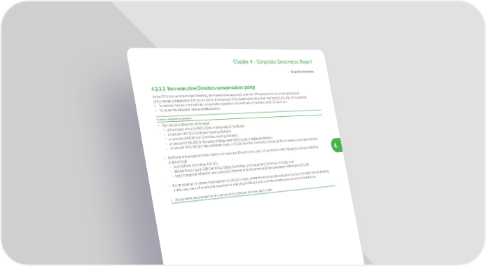 335 Life Is On | Schneider Electric www.se.com Chapter 4 – Corporate Governance Report Corporate Governance 4. 4.2.3.2 Non-executive Directors compensation policy At the 2019 Annual Shareholders’ Meeting, the shareholders approved under the 13 th resolution the maximum total amount of the annual compensation that can be paid to the members of the Board which since then stands at €2,500,000. It is proposed: • To maintain the cap of annual total compensation payable to the members of the Board at €2,500,000; and • To review the allocation rules as detailed below. Director’s individual compensation • Non-executive Directors will be paid: − a fixed basic amount of €25,000 for membership of the Board; − an amount of €7,000 per Board meeting attended; − an amount of €4,000 per Committee meeting attended; − an amount of €25,000 for the yearly strategy week (half in case of digital assistance); − an amount of €5,000 (for intercontinental travel) or €3,000 (for intra-continental travels) per Board session physically attended. • Additional annual payments are made to non-executive Directors who chair a Committee to reflect the additional responsibilities and workload: − Audit & Risks Committee: €20,000; − Human Resources & CSR Committee, Digital Committee, and Investment Committee: €15,000; and − Lead Independent Director, who is also the Chairman of the Governance & Remunerations Committee: €250,000. • For an observer, an annual fixed payment of €20,000 is paid, unless they become non-executive Director at the next General Meeting. In this case, they will receive the same fees for attending the Board and committee meetings as non-executive Directors. • All payments are prorated for time served during the year and are paid in cash.