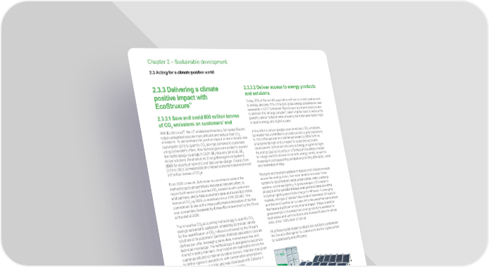 www.se.com Schneider Electric Universal Registration Document 2021 134 Chapter 2 – Sustainable development 2.3 Acting for a climate positive world 2.3.3 Delivering a climate positive impact with EcoStruxure ™ 2.3.3.1 Save and avoid 800 million tonnes of CO 2 emissions on customers’ end With EcoStruxure ™ , the IoT-enabled architecture, Schneider Electric helps companies become more efficient and reduce their CO 2 emissions. To demonstrate this positive impact, a new indicator was launched in 2018 to quantify CO 2 savings delivered to customers using Schneider’s offers. New technologies were added to expand the methodology coverage in 2021: SF 6 recovery services, SF 6 AirSet solutions, Field Services, Energy Management Systems (EMS for electrical network) and data center design. Overall, from 2018 to 2021, Schneider Electric helped customers save and avoid 347 million tonnes of CO 2 e. From 2021 onwards, Schneider is committed to extend the methodology to progressively include all relevant offers, to report both saved and avoided CO 2 emissions with customers and partners, and to help customers save and avoid 800 million tonnes of CO 2 by 2025, cumulatively since 2018 (SSI #2). This commitment is one of the three performance indicators of the first ever convertible Sustainability-Linked Bond launched by the Group at the end of 2020. The innovative CO 2 accounting methodology to quantify CO 2 savings delivered to customers, created by Schneider, allows for the quantification of CO 2 induced and saved by the Group’s solutions at its customers’ premises. Detailed calculation rules are defined per offer, leveraging sales data, market expertise, and technical knowledge. The methodology is designed to become a shared industry standard, its principles are applicable across the capital goods and consumer durables sectors. Attention was given to define rigorous calculations, with conservative assumptions. The methodology is public and was developed with Carbone 4, an expert CO 2 accounting consulting company. Saved emissions are net emissions (savings are netted from use-phase induced emissions) and consider savings delivered on brownfield (retrofit) projects. Avoided emissions are defined with respect to greenfield sales (new infrastructures); they are defined as a limitation of emissions increase versus a reference scenario. Avoided emissions are net emissions. They represent the difference between emissions of a reference scenario and emissions with the implementation of Schneider Electric’s offer. Schneider’s methodology, “Saved and avoided CO 2 : decarbonization creates value” is available for download on se.com; as well as the detailed methodology (and hypothesis) for all Schneider’s solutions 2.3.3.2 Deliver access to energy products and solutions Today, 25% of the world’s population still has no or reduced access to energy, and only 17% of the total global energy consumption was renewable in 2017. Schneider Electric’s products and solutions aim to address this “energy paradox”, balancing the need to reduce the planet’s carbon footprint while ensuring the inalienable human right to quality energy and digital access. In line with its carbon pledge towards net-zero CO 2 emissions, Schneider has committed to provide access to green electricity to 100 million people in underserved areas by 2030, both as a fundamental right and a means for social and economic development. Schneider’s Access to Energy program bridges the energy gap by focusing on offerings and business models for village electrification and domestic energy needs, as well as investing in and supporting companies providing affordable, clean, and renewable energy. Products and solutions address individual and collective needs across the energy chain, from solar lanterns and solar home systems to decentralized small power plants, water pumping systems, and street lighting. A great example of Schneider’s products is the portable Mobiya solar powered lamp providing individual lighting and mobile charge for 48 hours. In emerging markets, this type of device helps extend the number of hours of activities and livelihoods, but also limits the use of kerosene lamps that have a significant environmental impact. Villaya is another great example of decarbonized energy solutions available for businesses and communities to ensure electrification in remote sites, either 100% solar or hybrid. All of these social impact products and solutions complement the Group’s offerings for its customers to be the digital partner for sustainability and efficiency.