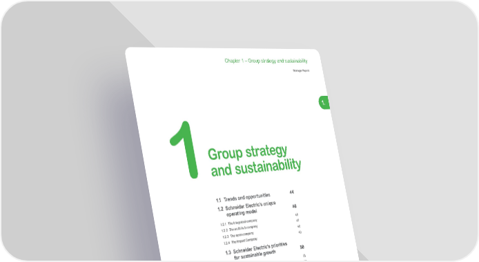 43 Life Is On | Schneider Electric www.se.com Chapter 1 – Group strategy and sustainability Strategic Report 1. 1.1 Trends and opportunities 44 1.2 Schneider Electric’s unique operating model 46 1.2.1 The integrated company 46 1.2.2 The multi-hub company 47 1.2.3 The open company 48 1.2.4 The Impact Company 49 1.3 Schneider Electric’s priorities for sustainable growth 50 1.3.1 More Services 51 1.3.2 More Software for unified asset lifecycle management 52 1.3.3 Sustainability Business 53 1.3.4 Global supply chain 54 1.3.5 SE Ventures 55 1.4 Customer focus 56 Group strategy and sustainability 1