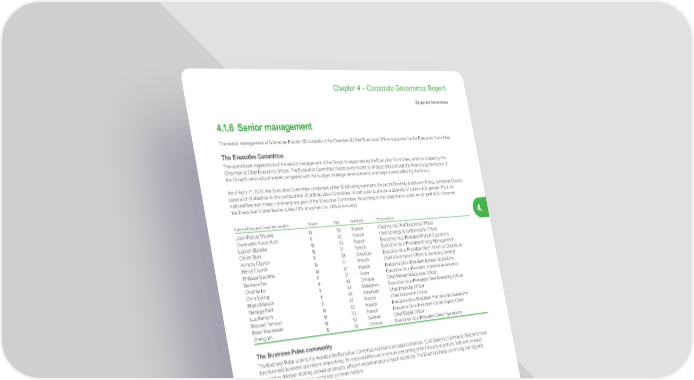 309 Life Is On | Schneider Electric www.se.com Chapter 4 – Corporate Governance Report Corporate Governance 4. 4.1.6 Senior management The senior management of Schneider Electric SE consists of the Chairman & Chief Executive Officer supported by the Executive Committee. The Executive Committee The operational organization of the senior management of the Group is supported by the Executive Committee, which is chaired by the Chairman & Chief Executive Officer. The Executive Committee meets every month to analyze and evaluate the financial performance of the Group’s various businesses compared with the budget, strategic developments, and major events affecting the Group. As of April 1 st , 2022, the Executive Committee comprises of the 16 following members. As per its Diversity & Inclusion Policy, Schneider Electric pays a lot of attention to the composition of its Executive Committee, in particular to ensure a diversity of culture and gender. Thus, six nationalities from three continents are part of the Executive Committee. According to the objective to comprise at least 40% of women, the Executive Committee includes 44% of women ( vs. 38% previously). Name of Executive Committee member Gender Age Nationality Responsibility Jean-Pascal Tricoire M 58 French Chairman & Chief Executive Officer Gwenaelle Avice-Huet F 42 French Chief Strategy & Sustainability Officer Laurent Bataille M 43 French Executive Vice-President France Operations Olivier Blum M 51 French Executive Vice-President Energy Management Annette Clayton F 58 American Executive Vice-President North America Operations Hervé Coureil M 51 French Chief Governance Officer & Secretary General Philippe Delorme M 51 French Executive Vice-President Europe Operations Barbara Frei F 51 Swiss Executive Vice-President Industrial Automation Charise Le F 49 Chinese Chief Human Resources Officer Chris Leong F 54 Malaysian Executive Vice-President Chief Marketing Officer Hilary Maxson F 44 American Chief Financial Officer Nadège Petit F 42 French Chief Innovation Officer Luc Rémont M 52 French Executive Vice-President International Operations Mourad Tamoud M 50 French Executive Vice-President Global Supply Chain Peter Weckesser M 53 German Chief Digital Officer Zheng Yin M 50 Chinese Executive Vice-President China Operations The Business Pulse community The Business Pulse community includes the Executive Committee members and approximatively 1,000 leaders of Schneider Electric’s main functions and business operations respectively. Its responsibilities are to ensure cascading of the Group’s objectives, help ensure rapid, responsive decision-making, as well as smooth, efficient implementation of such decisions. The Business Pulse community met digitally seven times in total in 2021 to exchange on these matters.