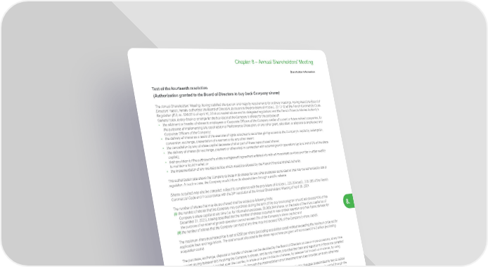 455 Life Is On | Schneider Electric www.se.com Chapter 8 – Annual Shareholders’ Meeting Shareholder Information 8. Text of the fourteenth resolution (Authorization granted to the Board of Directors to buy back Company shares) The Annual Shareholders’ Meeting, having satisfied the quorum and majority requirements for ordinary meetings, having heard the Board of Directors’ report, hereby authorizes the Board of Directors, pursuant to the provisions of Article L. 22-10-62 of the French Commercial Code, Regulation (EU) no. 596/2014 of April 16, 2014 on market abuse and its delegated regulations and the French Financial Market Authority’s General rules, to buy-back or arrange for the buy-back of the Company’s shares for the purpose of: • the allotment or transfer of shares to employees or Corporate Officers of the Company and/or of current or future related companies, for the purposes of implementing any stock option or Performance Share plan, or any other grant, allocation, or disposal to employees and Corporate Officers of the Company; • the delivery of shares as a result of the exercise of rights attached to securities giving access to the Company’s capital by redemption, conversion, exchange, presentation of a warrant or by any other mean; • the cancellation by way of share capital decrease of all or part of these repurchased shares; • the delivery of shares (for exchange, payment or otherwise) in connection with external growth operations (up to a limit of 5% of the share capital); • their provision for the purposes of a share management agreement entered into with an investment services provider in order notably to maintain a liquid market; or • the implementation of any market practice which would be allowed by the French Financial Market Authority. This authorization also allows the Company to trade in its shares for any other purposes authorized or that may be authorized by law or regulation. In such a case, the Company would inform its shareholders through a public release. Shares acquired may also be canceled, subject to compliance with the provisions of Articles L. 225-204 and L. 225-205 of the French Commercial Code and in accordance with the 24 th resolution of the Annual Shareholders’ Meeting of April 28, 2021. The number of shares that may be purchased shall be subject to following limits: (i) the number of shares that the Company may purchase during the term of the buy-back program should not exceed 10% of the Company’s share capital at any time (i.e. for information purposes, 56,903,344 shares, on the basis of the share capital as of December 31, 2021), it being specified that the number of shares acquired in view of their retention and their future delivery for the purpose of an external growth operation cannot exceed 5% of the Company’s share capital; and (ii) the number of shares that the Company can hold at any time may not exceed 10% of the Company’s share capital. The maximum share purchase price is set at €250 per share (excluding acquisition costs) without exceeding the maximum price set by applicable laws and regulations. The total amount allocated to the share repurchase program will not exceed €14.2 billion (excluding acquisition costs). The purchase, exchange, disposal or transfer of shares can be decided by the Board of Directors on one or more occasions, at any time except during takeover bid involving the Company’s shares, and by any means, provided that laws and regulations in force are complied with, on or off the stock market, over the counter, in whole or in part in blocks of shares, by takeover bid in cash or in shares, by using options or derivatives, either directly or indirectly through the intermediation of an investment services provider, or in any other way. The Annual Shareholders’ Meeting grants authority to the Board of Directors, which may further delegate as permitted by law, to adjust the price set forth above in the event of transactions on the Company’s share capital, and in particular an increase in capital through the capitalization of reserves, the allocation of free shares, a stock split or reverse stock split, the distribution of reserves or any other assets, impairment of share capital or any other transaction involving share capital or shareholders’ equity, to take into account the impact of these transactions on the stock value. The Annual Shareholders’ Meeting gives full powers to the Board of Directors with powers to subdelegate under the conditions set out by law, to use this authorization, in particular to give any and all orders, enter into any and all agreements, allocate or reallocate the shares acquired to the objectives pursued under the applicable legal and regulatory conditions, set the terms and conditions under which the rights of holders of securities giving access to the share capital or other rights giving access to the share capital will be preserved, if applicable, in accordance with legal and regulatory provisions and, if applicable, contractual provisions providing for other cases of adjustment, prepare all documents and press releases, carry out any and all formalities and make all appropriate declarations to the authorities, and in general take all necessary measures. This authorization supersedes, for the unused portion, the authorization given to the Board of Directors by the Shareholders’ Meeting of April 28, 2021 in its 15 th resolution and is granted for an eighteen (18)-month period as from this Annual Shareholders’ Meeting.