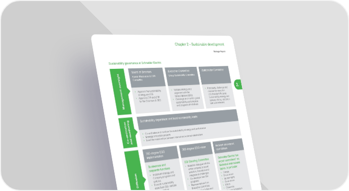 73 Life Is On | Schneider Electric www.se.com Chapter 2 – Sustainable development Strategic Report 2. 2.1.4.3 Diffusion 2.1.4.3.1 The Schneider Sustainability Impact Steering Committee In 2020, a specific SSI Steering Committee was created, with about 50 members: representants of each Executive Committee member, each geography, function, and business unit. Three all- hands workshops took place, and the sustainability team organized individual follow up interviews with each member to define precise and measurable programs for the 2021 – 2025 SSI. 2.1.4.3.2 SSI and SSE pilots and sponsors The execution of Schneider Sustainability Impact and Schneider Sustainability Essentials programs is ensured, for each program, by operational managers or “pilots”, and SVP-level as well as Executive Committee level sponsors. 2.1.4.3.3 Other key organizations Several other Committees and organizations drive progress on all pillars of the sustainability strategy, for instance: • Global Supply Chain organization, with responsibilities including safety and the environment; • Human Resources organization; • The Ethics & Compliance organization. Sustainability Fellows network, Volunteers, Schneider Electric Foundation delegates Board of Directors Human Resources & CSR Committee • Approve the sustainability strategy and SSI • Approve LTIP and STIP for the Chairman & CEO 360-degree ESG implementation Businesses and corporate functions • Implement strategy and Company programs and policies • Execute sustainability objectives (SSI, variable compensation) • Support awareness • Innovate 360-degree ESG vision SSI Steering Committee • Establish dialogue with the entire company to boost ambition, innovation and integrate all challenges • Co-develops new SSI programs • Representatives from Executive Committee, operational activities and central functions Network and expert committees Schneider Electric has expert committees* on dedicated and material topics, in particular: • Climate • Environment • Human rights • Governance • Ethics • Citizenship • Diversity & Inclusion All employees Executive Committee Group Sustainability Committee Stakeholder Committee • Validate strategy and alignment with the United Nations SDGs • Challenge and monitor global sustainability performance and progress of initiatives • Participate, challenge and oversee the execution of Schneider’s Purpose, Sustainability strategy and delivery of long- and short- term commitments Sustainability department and local sustainability leads • Co-ordinates and monitors the sustainability strategy and performance • Manage innovation projects • Lead the relationships between internal and external stakeholders Diffusion Co-ordination and monitoring Management oversight * Non-exhaustive list: Access to Energy Committee, Carbon Committee, SERE (Safety Environment Real Estate) Committee, Ethics Committee & Fraud Committee, Duty of Vigilance Committee, Foundation’s Executive Committee & Schneider VolunteerIn Board, HR Committee, Diversity & Inclusion Committee, SSI pilots, and sponsors. Sustainability governance at Schneider Electric