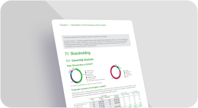 www.se.com Schneider Electric Universal Registration Document 2021 434 Chapter 7 – Information on the Company and its capital This chapter includes elements of the Board of Directors’ Corporate Governance Report. The table of section 7.2.3 (Pending delegations relating to share capital increase and decrease), sections 7.4.1 (Annual Shareholders’ Meetings), 7.4.2 (Voting rights), 7.4.8 (Publication of information of Article L. 22-10-11 of the French Commercial Code), and Chapter 4 constitute the Board of Directors’ Corporate Governance Report prepared in accordance with Article L. 225-37 of the French Commercial Code. They are indicated with a special mention. 7.1 Shareholding 7.1.1 Ownership structure Major Shareholders at 12/31/21 (1) 48.4% 30.0% 5.1% 0.3% 3.6% 2.2% 11.0% Western Europe North America Asia Pacific Rest of World Employee holdings Treasury shares Other (mainly individual shareholders) 7.0% 6.3% 3.6% 2.2% 80.9% Sun Life BlackRock, Inc. Employees Treasury shares Public (1) Charts lists ownership stakes to the best of the Company’s knowledge. Three-year summary of changes in capital (2) At December 31, 2021, the share capital of Schneider Electric was €2,276,133,768, divided into 569,033,442 common shares, to which 595,320,658 theoretical voting rights are attached. The following table presents, to the best of the Company’s knowledge, changes in the distribution of the Company’s share capital and voting rights over the last three years. Dec. 31, 2021 Dec. 31, 2020 Dec. 31, 2019 Capital % Number of shares Voting rights % Number of voting rights Capital % Voting rights % Capital % Voting rights % Sun Life Financial, Inc. (3) 7.0 39,681,766 6.8 39,681,766 8.3 7. 9 8.5 8 .1 BlackRock, Inc. 6.3 35,703,751 6 .1 35,703,751 6.4 7.7 6.2 6.0 Employees (4) 3.6 20,321,627 6.3 36,557,595 3.7 6 .1 3.7 6.3 Treasury shares 2.2 12,456,882 – – 2.3 – 5.3 – Public 80.9 460,869,416 80.8 470,920,335 79.3 78.3 76.2 79.6 TOTAL 100.0 569,033,442 100.0 582,863,776 (5) 100.0 100.0 100.0 100.0 (2) Table lists ownership stakes that have breached 5% ownership voting rights threshold in the previous three years, to the best of the Company’s knowledge. (3) These shares are mainly held by funds managed by MFS Investment Management which is part of Sun Life Financial, Inc. (4) The total number of shares held by employees include: – 8,392,000 shares held by the FCPE Actionnariat (France), corresponding to 1.5% of capital and 2.9% of voting rights, – 5,102,400 shares held by the FCPE Actionnariat Mondial (International), corresponding to 0.9% of capital and 1.6% of voting rights, and – 6,827,227 shares held directly by employees, corresponding to 1.2% of capital and 1.8% of voting rights. (5) Number of voting rights excluding shares deprived of voting rights. Disclosure thresholds To the best of the Company’s knowledge, no shareholders other than Sun Life Financial, Inc. and BlackRock Inc., both listed above, hold, either directly or indirectly, more than 5% of Schneider Electric’s capital or voting rights. Changes in holdings (for stake equal to or greater than 5%) To the best of the Company’s knowledge, no additional shareholders have made a change in holding during 2021 that crosses 5% threshold for either capital or voting rights. Control of the Company At December 31, 2021, to the best of its knowledge, the Company was not controlled and has not been subject to any agreement binding on one or more shareholders or any other individual or legal entity, acting alone or in concert, concerning the direct or indirect holding of its capital or its control, or for which the implementation thereof might subsequently involve a change in the Company’s control. Shareholder pacts or agreements involving Schneider Electric shares The Company has no knowledge of shareholder pacts or agreements, nor of shareholders acting in concert with regard to the shares comprising its share capital.