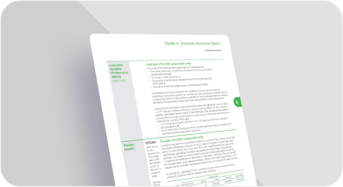 319 Life Is On | Schneider Electric www.se.com Chapter 4 – Corporate Governance Report Corporate Governance 4. Long-term incentive (Performance shares) (continued) Application of the 2021 compensation policy The volume of the maximum annual award was set in consideration of: • The market practice and competitive positioning of the Chairman and CEO’s compensation package; • The Group’s resilient performance; • The structure of performance measurement governing the final acquisition of LTIP awards; • The culture of ownership deeply rooted in Schneider Electric’s DNA. Considering the continuous increase in the Company’s stock price and in the spirit of maintaining a culture of moderation in an uncertain economic environment, the Board decided to reduce the number of shares granted to Jean-Pascal Tricoire markedly below the maximum allowed by the compensation policy, which would represent 60,000 performance shares. According to the authorization given by the Annual Shareholders’ Meeting on April 25, 2019 in its 21 st resolution, the Board of Directors, during its meeting of March 25, 2021 decided to grant Mr. Jean-Pascal Tricoire a total of 37,903 Performance Shares (representing 0.006% of Schneider Electric’s share capital) subject to the performance criteria described above and measured over a period of three years: • 11,371 Performance Shares under Plan n° 38 in his capacity as Chairman and CEO of Schneider Electric SE; • 26,532 Performance Shares under Plan n° 39 in his capacity as Regional Asia President and Chairman of Schneider Electric Asia Pacific. Pension benefits €572,941 (amount due for 2021 (fixed portion of €191,600 paid in 2021 and variable portion of €381,3 41 to be paid in 2022)) Reminder: €421,252 (amount due for 2020 (fixed portion of €191,600 paid in 2020 and variable portion of €229,652 paid in 2021)) Reminder of the 2021 compensation policy Complementary payments are intended to take account of the fact that, following the decision of the Board of Directors on February 18, 2015 to remove the benefit of the defined-benefit pension scheme (Article 39) for Corporate Officers, Mr. Jean-Pascal Tricoire is personally responsible for building up his pension. He undertook to redirect these complementary payments, net of taxes, to investment vehicles devoted to financing his additional pension. To determine this authorized complementary compensation, the Board of Directors sought the recommendation of an independent expert, namely the firm Willis Towers Watson, and ensured that the mechanism implemented therefore, was in line with shareholders’ interests. Accordingly, Mr. Jean-Pascal Tricoire is entitled to receive annually a complementary component, split into a fixed and variable portion as follows: Variable portion Fixed portion Target (% of Fixed) Minimum At target Maximum Total at Target €191,600 130% €0 €249,080 €498,160 €440,680 The variable part is dependent on performance criteria aligned with the variable annual compensation (see above). Application of the 2021 compensation policy At the meeting held on February 16, 2022, the annual complementary variable portion for pension for 2021 to be paid after the Annual Shareholders’ Meeting if the latter approves it, was set by the Board of Directors at 199% of the annual complementary fixed portion, i.e. an achievement rate of 153.1%. For 2021, Mr. Jean-Pascal Tricoire is entitled to receive: Fixed amount Target achievement rate Variable amount (1) Total due for 2021 €191,600 130% € 381,3 41 € 572,941 (1) Calculated by applying to the fixed compensation above the percentage of target achievement determined for the calculation of the 2021 annual variable compensation, i.e. 15 3 .1% . In compliance with applicable law, the payment of the variable amount will be subject to shareholders’ approval (see 8 th resolution submitted to the Annual Shareholders’ Meeting of May 5, 2022). Reminder: an amount of €229,652 was paid in 2021 to Mr. Jean-Pascal Tricoire for the variable portion of his pension due for the fiscal year 2020 after its approval by the Annual Shareholders’ Meeting on April 28, 2021 (see page 273 of the 2020 Universal Registration Document).