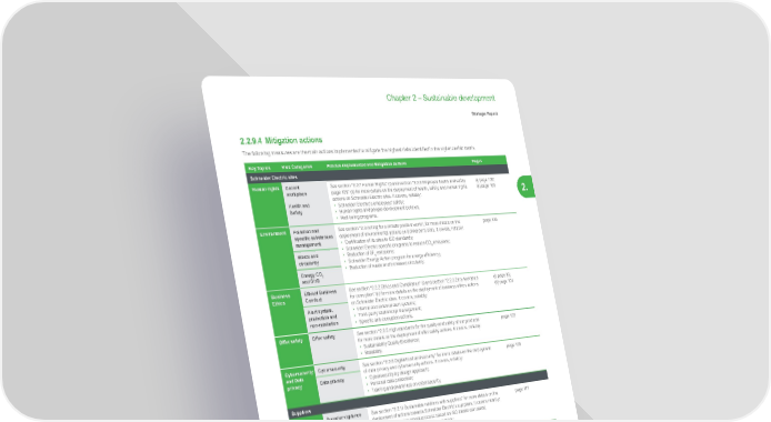115 Life Is On | Schneider Electric www.se.com Chapter 2 – Sustainable development Strategic Report 2. 2.2.9.4 Mitigation actions The following measures are the main actions implemented to mitigate the highest risks identified in the vigilance risk matrix. Key Topics Risk Categories Policies implemented and Mitigation Actions Pages Schneider Electric sites Human rights Decent workplace See section “2.2.7 Human Rights” (i) and section “2.2.8 Employee health and safety page 109” (ii) for more details on the deployment of health, safety, and human rights actions on Schneider Electric sites. It covers, notably: • Schneider Electric’s employees’ safety; • Human rights and people development policies; • Well-being programs. (i) page 106; (ii) page 109 Health and Safety Environment Pollution and specific substances management See section “2.3 Acting for a climate positive world”, for more details on the deployment of environmental actions on Schneider’s sites. It covers, notably: • Certification of its sites to ISO standards; • Schneider Electric specific programs to reduce CO 2 emissions; • Reduction of SF 6 emissions; • Schneider Energy Action program for energy efficiency; • Reduction of waste and increased circularity. page 126 Waste and circularity Energy CO 2 and GHG Business Ethics Ethical Business Conduct See section “2.2.2 Ethics and Compliance” (i) and section “2.2.3 Zero-tolerance for corruption” (ii) for more details on the deployment of business ethics actions on Schneider Electric sites. It covers, notably: • Internal and external alert systems; • Third-party relationship management; • Specific anti-corruption actions. (i) page 95; (ii) page 101 Alert system, protection and non-retaliation Offer safety Offer safety See section “2.2.5 High standards for the quality and safety of our products” for more details on the deployment of offer safety actions. It covers, notably: • Sustainability Quality Excellence; • Reliability. page 102 Cybersecurity and Data privacy Cybersecurity See section “2.2.6 Digital trust and security” for more details on the deployment of data privacy and cybersecurity actions. It covers, notably: • Cybersecurity by design approach; • Personal data protection; • Training and awareness on cybersecurity. page 105 Data privacy Suppliers Suppliers Supplier vigilance See section “2.2.11 Sustainable relations with suppliers” for more details on the deployment of actions towards Schneider Electric’s suppliers. It covers notably: • Continuous Improvement process based on ISO 26000 standards; • Decent Work program for strategic suppliers; • Vigilance plan for suppliers; • Zero Carbon Project. p ag e 117 Subcontractors Sub- contractors Subcontractors vigilance See section “2.2.10 Relations with project execution contractors” for more details on the deployment of actions towards Schneider Electric’s subcontractors (or solution suppliers). It covers notably: • Integration of ESG into the project decision making; • Vigilance plan for project contractors. p ag e 116 Local Communities Local communities Around Schneider Electric sites See section “2.2.12 Vigilance with local communities” for more details on the deployment of health, safety, and human rights actions around Schneider Electric and customer projects sites. It covers, notably: • Risk mitigation around Schneider Electric sites; • Risk mitigation around customer project sites. page 124 Around customer projects sites