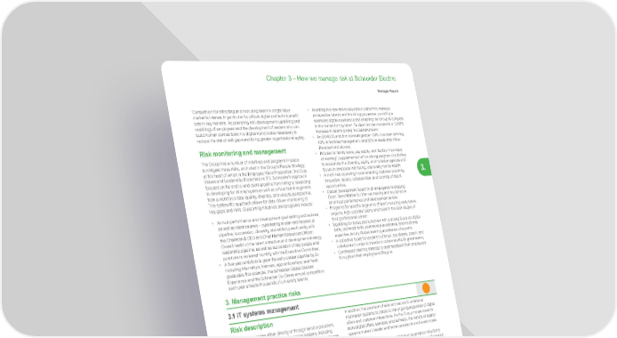 263 Life Is On | Schneider Electric www.se.com Chapter 3 – How we manage risk at Schneider Electric Strategic Report 3. Competition for attracting and recruiting talent in a tight labor market is intense, in particular for critical digital and technical skill sets in key markets. Accelerating skill development (upskilling and reskilling) of employees and the development of leaders who can build human connections in a digital world is also necessary to reduce the risk of skill gaps and bring greater organizational agility. Risk monitoring and management The Group has a number of initiatives and programs in place to mitigate these risks, anchored in the Group’s People Strategy, at the heart of which is the Employee Value Proposition, the Core Values and Leadership Expectations 2.0. Schneider’s approach focuses on the end-to-end talent pipeline from hiring to rewarding to developing for all employees as well as critical talent segments from a workforce size, quality, diversity, and velocity perspective. This systematic approach allows for data-driven monitoring of key gaps and risks. Supporting initiatives and programs include: • Annual performance and development goal setting and reviews, as well as talent reviews – culminating in year-end reviews of pipeline, succession, diversity, and skills by each entity with the Chairman & CEO and Chief Human Resources Officer. Overall health of the talent attraction and development strategy, leadership pipeline, as well as succession of key people and positions is reviewed monthly with the Executive Committee; • A five-year ambition to grow the early-career pipeline by 2x including internships, trainees, apprenticeships, and fresh graduates. For example, the Schneider Global Student Experience and the Schneider Go Green annual competition each year attracts thousands of university talents; • Investing in a new talent acquisition platform to manage prospective talents and the hiring processes, providing a seamless digital experience and enabling the Group to compete in the market for top talent. To date this has resulted in a 1,000% increase in talents joining the talent network; • An 50/40/30 ambition towards gender: 50% of women in hiring, 40% in frontline management, and 30% in leadership (Vice- President and above); • Policies for family leave, pay equity, and flexible “new ways of working”, supplemented with a strong program of activities to accelerate the diversity, equity, and inclusion agenda and focus on employee well-being, especially mental health; • A multi-hub operating model enabling customer proximity, innovation, speed, collaboration, and diversity of talent opportunities; • Career development focus for all employees, leveraging Open Talent Market for internal mobility and anchored in an annual performance and development review; • Programs for specific segments of talent including early talent, experts, high-potential talent, and talent in the later stages of their professional career; • Upskilling for today and tomorrow with a strong focus on digital skills, technical skills, commercial excellence, and functional expertise, led by Global learning academies of experts; • A collective focus for leaders to disrupt, accelerate, coach, and collaborate in order to transform culture and build great teams; • Continuous listening strategy to seek feedback from employees throughout their employment lifecycle. 3. Management practice risks 3.1 IT systems management Risk description The Group operates either directly or through service providers, a wide range of highly complex information systems, including servers, networks, data repositories, applications, and databases with three targeted landing zones, on premise, co-location hubs, and in the cloud, that are essential for the efficiency of its sales and manufacturing processes, as well as platforms to enable digital offers such as EcoStruxure ™ . The Group is deploying various applications aimed at enhancing commercial experience, employee experience, and supply chain efficiency as well as enabling digital commercial offers. Significant failure in fulfilment by a service provider or a major network outage, hardware and/or system failure could adversely affect the quality of service offered by Schneider Electric. In addition, the provision of safe and secure foundational Information Systems is critical to the ongoing expansion of digital offers and customer interactions. As the Group moves towards more digital offers, services, and software, the variety of legacy systems makes it harder and more complex to evolve and scale. Despite the Group’s policy of establishing governance structures and contingency plans, there can be no assurance that information systems projects will not be subject to technical problems and/ or execution delays. While it is difficult to accurately quantify the impact of any such problems, data loss, or delays, they could have an adverse effect on inventory levels, service quality, and, consequently, on the Group’s financial results.