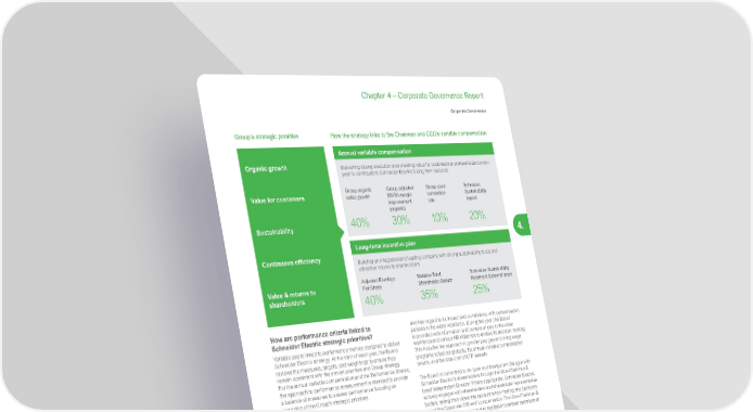 327 Life Is On | Schneider Electric www.se.com Chapter 4 – Corporate Governance Report Corporate Governance 4. Group’s strategic priorities How the strategy links to the Chairman and CEO’s variable compensation Long-term incentive plan Annual variable compensation Delivering strong execution and creating value for customers and shareholders every year to contribute to Schneider Electric’s long-term success Building an integrated and leading company with strong sustainability focus and attractive returns to shareholders Group organic sales growth 40% Group adjusted EBITA margin improvement (organic) 30% Group cash conversion rate 10% Schneider Sustainability Impact 20% Adjusted Earnings Per Share 40% Relative Total Shareholder Return 35% Schneider Sustainability Relative & External Index 25% Organic growth Value for customers Sustainability Continuous efficiency Value & returns to shareholders How are performance criteria linked to Schneider Electric strategic priorities? Variable pay is linked to performance metrics designed to deliver Schneider Electric strategy. At the start of each year, the Board reviews the measures, targets, and weightings to ensure they remain consistent with the annual priorities and Group strategy. For the annual variable compensation and the Performance Shares, the approach to performance measurement is intended to provide a balance of measures to assess performance focusing on execution of the Group’s strategic priorities. Considerations of wider workforce compensation and shareholders’ views The Board monitors and reviews the effectiveness of the compensation policy for Corporate Officer and senior management and has regard to its impact and consistency with compensation policies in the wider workforce. During the year, the Board is provided with information and context on pay in the wider workforce and various HR initiatives to enable its decision-making. This includes the approach to gender pay gap and living wage programs rolled out globally, the annual variable compensation results, and the total cost of LTIP awards. The Board is committed to an open and transparent dialogue with Schneider Electric’s shareholders through the Vice-Chairman & Lead Independent Director. Where appropriate, Schneider Electric actively engages with shareholders and shareholder representative bodies, taking their views into account when making any decisions about the Corporate Officers’ compensation. The Vice-Chairman & Lead Independent Director is also available to answer questions at the Annual Shareholders’ Meeting. 2021 Compensation Pillars and Principles Pay for Performance Alignment with shareholders’ interest Competitiveness • Principle 1: Prevalence of variable components: circa 80% for CEO (at target). • Principle 2: Performance is evaluated via economic and measurable criteria. • Principle 3: Financial and Sustainability objectives are fairly balanced and distributed between short-term (annual variable compensation) and medium-term (long-term incentive) components. • Principle 4: Significant proportion of the total compensation delivered in shares. • Principle 5: Performance conditions support Schneider Electric’s strategic priorities and are aligned with shareholders’ expectations. • Principle 6: To benchmark the Corporate Officer’s compensation package “at target” in the median range of the Company’s updated peer group. • Principle 7: To reference the CAC 40 third quartile and the Stoxx Europe 50 median.