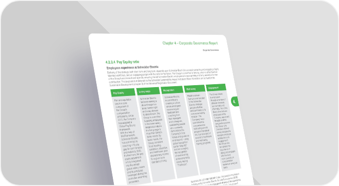 323 Life Is On | Schneider Electric www.se.com Chapter 4 – Corporate Governance Report Corporate Governance 4. 4.2.2.4 Pay Equity ratio Employees experience at Schneider Electric Delivery of the strategy, both short term and long term, depends upon Schneider Electric’s success in attracting and engaging a highly talented workforce, and on equipping people with the skills for the future. The Group is committed to fair pay, which is at the forefront of the Group’s and executives’ agenda, ensuring that all Schneider Electric employees are appropriately and fairly rewarded for their contribution. The progress is monitored via the Schneider Sustainability Impact Indicators. More information can be found in the Sustainable Development (chapter 2) of the Universal Registration Document. Pay Equity Living wage Recognition Well-being Engagement Fair and equitable pay is a core component of the Group’s compensation philosophy. Since 2015, the Company has adopted a Global Pay Equity Framework. With the help of this Framework, Schneider Electric has committed to reaching <1% pay gap for both females and males by 2025. Furthermore, the pay equity adjustment is fully integrated into the annual global salary review and its principles leveraged during the promotion and hiring processes. Schneider Electric believes earning a decent wage is a basic human right and a key element to decent work. The Group is committed to paying employees in the lower salary ranges at or above the living wage to meet their family’s basic needs. By basic needs, the Group considers food, housing, sanitation, education, and healthcare, plus discretionary income for a given local standard of living. Schneider Electric is committed to creating a culture where employees receive regular feedback and coaching from their managers and colleagues, celebrating people who constantly demonstrate the Company’s Core Values and go above and beyond – using global recognition portal “Step Up” and encouraging the recognition of small and big achievements by simply saying “Thank you”. Health and well- being are embedded in the Schneider Electric strategic people priorities and contribute to its core sustainability mission. The Company has a commitment to comprehensive well-being at work program translated into dual standard of access to healthcare and well-being training programs. The Group listens to employees through a number of different channels, both formally and informally. Two of the Board directors are employees of the Company, appointed through a formal designation process. the Group runs OneVoice internal survey designed to measure employee satisfaction and engagement; the Group also recognizes the importance of dialog and engages with the local work councils on compensation matters on a regular basis. Pay Equity Ratio Equity pay ratio measures the ratio between the level of compensation of the Chairman and CEO and the average and median compensation of the employees, as required by Article L.22-10-9-3 6° and 7° of the French Commercial Code. Calculation methodology The compensation comparisons and pay ratios set out below were calculated based on the fixed and variable compensation paid and relevant benefits during the fiscal years indicated, and Performance Shares granted during the same periods valued at their fair value (IFRS) on the grant date. The calculation includes employees who were continously employed during the financial years concerned. For part-time employees, compensation was established on a full-time equivalent basis. Scope France perimeter: The legal scope, the issuer, comprises of only one employee, therefore, an alternate “relevant scope” was defined to reflect a larger representative employee population in France as prescribed by article 26.2 of AFEP-MEDEF Code. It is based on the French holding entity Schneider Electric Société Européenne (SESE) (the issuer) as well as all employees in France of the operational company Schneider Electric Industries (SAS). This group of employees is employed on comparable terms to the Corporate Officer and represents more than 4,000 employees in France on a full time equivalent basis. Global perimeter: In addition, from 2021 the Board of Directors, upon recommendation of the Governance & Remunerations Committee and of the Human Resources & CSR Committee, decided to voluntarily report the evolution of the pay ratio between the Chairman and CEO and the average and median compensation of the employees on a broader scope which includes approximately 117,000 Schneider Electric employees across the top 30 countries (“Global Scope”). This represents circa 84% of all Schneider Electric employees globally. There is no historical data for this ratio as the HR Information System was not ready before to report on this extended scope.
