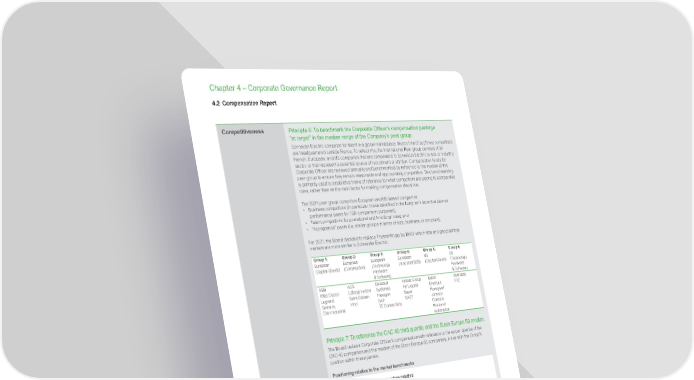 www.se.com Schneider Electric Universal Registration Document 2021 314 Chapter 4 – Corporate Governance Report Competitiveness Principle 6: To benchmark the Corporate Officer’s compensation package “at target” in the median range of the Company’s peer group. Schneider Electric competes for talent in a global marketplace. Most of the Group’s key competitors are headquartered outside France. To reflect this, the International Peer group consists of 24 French, European, and US companies that are comparable to Schneider Electric in size or industry sector, or that represent a potential source of recruitment or attrition. Compensation levels for Corporate Officer are reviewed annually and benchmarked by reference to the median of this peer group to ensure they remain reasonable and appropriately competitive. This benchmarking is primarily used to establish a frame of reference for what competitors are paying to comparable roles, rather than as the main factor for making compensation decisions. The 2021 peer group comprises European and US-based companies: • Business competitors (in particular, those identified in the Long-term incentive plan as performance peers for TSR comparison purposes); • Talent competitors for operational and functional roles; and • “Acceptance” peers ( i.e. similar groups in terms of size, business, or structure). For 2021, the Board decided to replace Thyssenkrupp by BASF which size and geographical markets are more similar to Schneider Electric. Group 1: European (Capital Goods) Group 2: European (Construction) Group 3: European (Technology Hardware & Software) Group 4: European (Industrial B2B) Group 5: US (Capital Goods) Group 6: US (Technology Hardware & Software) ABB Atlas Copco Legrand Siemens CNH Industrial ACS Lafarge Holcim Saint-Gobain Vinci Dassault Systèmes Hexagon SAP TE Connectivity Airbus Group Air Liquide Bayer BASF Eaton Emerson Honeywell Johnson Controls Rockwell Automation Autodesk PTC Principle 7: To reference the CAC 40 third quartile and the Stoxx Europe 50 median. The Board reviews Corporate Officer’s compensation with reference to the upper quartile of the CAC 40 companies and the median of the Stoxx Europe 50 companies, in line with the Group’s position within these panels. Positioning relative to the market benchmarks Total compensation includes base salary, annual incentive at target, and IFRS value of Performance Shares granted during the year. Chairman and CEO compensation relative to the market benchmarks CAC40 Company Peer Group Stoxx Europe 50 3 rd quartile Median 1 st quartile 25% 50% 75% Compa Ratio vs Q3 vs Median vs Median 70 116 75 85 65 86 Base Salary Base Salary Base Salary Total Comp. Total Comp. Total Comp. 4.2 Compensation Report