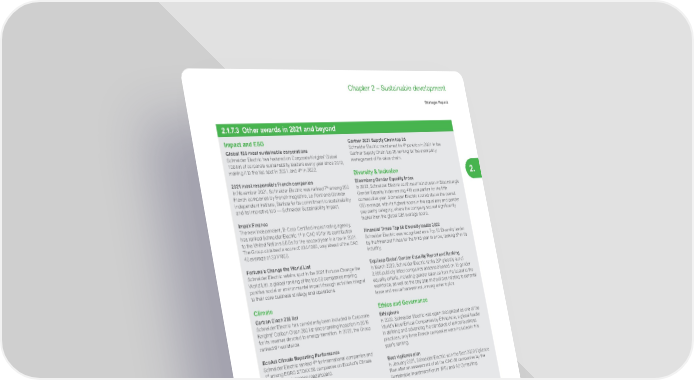 91 Life Is On | Schneider Electric www.se.com Chapter 2 – Sustainable development Strategic Report 2. 2.1.7.3 Other awards in 2021 and beyond Impact and ESG Global 100 most sustainable corporations Schneider Electric has featured on Corporate Knights’ Global 100 list of corporate sustainability leaders every year since 2012, making it to the top spot in 2021, and 4 th in 2022. 2021 most responsible French companies In November 2021, Schneider Electric was ranked 7 th among 250 French companies by French magazine, Le Point and German independent institute, Statista for its commitment to sustainability and its innovative tool — Schneider Sustainability Impact. Impak Finance The new independent, B-Corp Certified impact rating agency, has ranked Schneider Electric 1 st in CAC 40 for its contribution to the United Nations SDGs for the second year in a row in 2021. The Group obtained a score of 434/1000, way ahead of the CAC 40 average of 231/1000. Fortune’s Change the World List Schneider Electric retains spot in the 2021 Fortune Change the World List, a global ranking of the top 50 companies making positive social or environmental impact through activities integral to their core business strategy and operations. Climate Carbon Clean 200 list Schneider Electric has consistently been included in Corporate Knights’ Carbon Clean 200 list since ranking inception in 2016 for its revenue devoted to energy transition. In 2022, the Group ranked 9 th worldwide. EcoAct Climate Reporting Performance Schneider Electric ranked 4 th for international companies and 1 st among EURO STOXX 50 companies on EcoAct’s Climate reporting performance leaderboard. Champions du climat 2021 Recognized as a Climate Champion by Challenges, the French weekly business magazine, for reducing its annual Scope 1 and 2 GHG emissions. Supply Chain Best Global Sustainable Supply Chain Organization Schneider Electric has been named the Best Global Sustainable Supply Chain organization at the Global Sustainable Supply Chain Summit 2021 (GSSC Summit). This award puts Schneider Electric ahead of its peers in terms of operating greener and fairer supply chains. EcoVadis Sustainable Procurement Leadership Awards Schneider Electric was selected for the EcoVadis Sustainable Procurement Leadership Awards 2022, receiving the Best Value Chain Engagement award as a recognition of its excellence in engaging trading partners and internal stakeholders in sustainability initiatives. Gartner 2021 Supply Chain top 25 Schneider Electric maintained its 4 th position in 2021 in the Gartner Supply Chain top 25 ranking for the exemplary management of its value chain. Diversity & Inclusion Bloomberg Gender Equality Index In 2022, Schneider Electric confirmed its inclusion in Bloomberg’s Gender Equality Index among 418 companies for the fifth consecutive year. Schneider Electric scored above the overall GEI average, with its highest score in the equal pay and gender pay parity category, where the company scored significantly higher than the global GEI average score. Financial Times Top 50 Diversity leader 2022 Schneider Electric was recognized as a Top 50 Diversity leader by the Financial Times for the third year in a row, ranking 5 th in its industry. Equileap Global Gender Equality Report and Ranking In March 2022, Schneider Electric ranks 20 th globally out of 3,895 publicly listed companies assessed based on 19 gender equality criteria, including gender balance from the board to the workforce, as well as the pay gap and policies relating to parental leave and sexual harassment, among other topics. Ethics and Governance Ethisphere In 2022, Schneider Electric was again recognized as one of the World’s Most Ethical Companies by Ethisphere, a global leader in defining and advancing the standards of ethical business practices; only three French companies were included in this year’s ranking. Best vigilance plan In January 2021, Schneider Electric won the Best 2020 Vigilance Plan after an assessment of all the CAC 40 companies by the Sustainable Investment Forum (FIR) and A2 Consulting. Grand Prix de la Transparence In 2021, Schneider Electric remains in the Top 20 most transparent companies by ranking 11 th out of 141 companies, and was bestowed the Extra Financial Award (Grand Prix de l’Information Extra-Financiere). Employer awards Universum Top 50 World’s Most Attractive Employers In 2021, Schneider was recognized by students worldwide as one of the World’s Most Attractive Employers ranking 24 th in Engineering and IT by Universum. Over 220,000 respondents from the Universum Talent Surveys have ranked the companies they find most desirable to work for. Fortune’s World’s Most Admired Companies In 2022, Schneider is recognized by Fortune as one of the “World’s Most Admired Companies”, ranking 3 rd in the electronics industry sector for the fifth consecutive year. Glassdoor Schneider received a score of 4.2/5 from Glassdoor as of February 2022. Based on more than 10,000 reviews, 87% of surveyed participants would recommend the Group to a friend, and 96% approve the CEO.