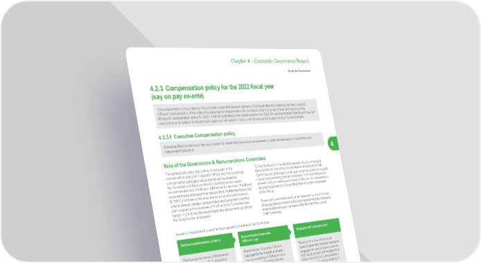 325 Life Is On | Schneider Electric www.se.com Chapter 4 – Corporate Governance Report Corporate Governance 4. 4.2.3 Compensation policy for the 2022 fiscal year (say on pay ex-ante ) The compensation policy intention is to provide a clear link between delivery of Schneider Electric’s strategy and the Corporate Officers’ compensation, while reflecting outcomes for shareholders. Set out below is the Corporate Officer and non-executive Directors’ compensation policy for 2022. It will be submitted to the shareholders at the 2022 Annual Shareholders’ Meeting (9 th and 10 th resolutions) and, subject to shareholders approval, will remain in force until the next policy is approved by the shareholders. 4.2.3.1 Executive Compensation policy Schneider Electric follows a rigorous process for determining executive compensation, under the leadership of committed and independent Directors. Role of the Governance & Remunerations Committee The general principles and criteria forming part of the compensation policy for Corporate Officer, and their individual compensation packages are prepared and reviewed by the Governance & Remunerations Committee which makes recommendations to the Board of Directors for decision. The Board receives inputs and recommendations from the Human Resources & CSR Committee on the incentive structure and performance criteria (annual variable compensation and Long-term incentive plan) applied to the members of the Executive Committee (see section 4.2.4 of the Universal Registration Document), as well as the Group’s other employees. To help the Board in the decision process, the Governance & Remunerations Committee and the Human Resources & CSR Committee are authorized to call upon external experts for specific topics, benchmarking data and analyses. The Committees hold at least one joint meeting every year to discuss the compensation structure applicable to Corporate Officer and other employees of the Group. These joint committee meetings are attended by one of the two employee Directors and the Director representing the employee shareholders who are members of the Human Resources & CSR Committee. As part of its preparatory work for its proposals to the Board, the Committee: Defines performance criteria Benchmarks Corporate Officers’ pay Engages with shareholders Defines performance criteria based on Schneider Electric’s executive compensation pillars and business strategy. Targets are determined at the beginning of the performance period in accordance with the goals of the Strategic Plan. Based on circumstances and priorities, the targets also encompass risks raised by the Audit & Risks Committee as well as the recommendations of the Human Resources & CSR Committee. Benchmarks Corporate Officer’s pay against the median of a peer group consisting of 24 French and international companies that are comparable to Schneider Electric in terms of market capitalization, revenue, and industry, or that represent a potential source of recruitment or attrition. This benchmarking is used as an indicator, not as a target, and is done ex-post only for reference. Relies on the Vice-Chairman & Lead Independent Director to directly engage with shareholders to ensure their perspectives and feedbacks on Schneider Electric’s compensation policy are heard and considered in decision-making. The topic of Corporate Officer’s compensation is usually discussed at four Board meetings every year. Corporate Officers do not take part in the debates of the Board concerning their own compensation. This process ensures consistency and alignment between the compensation policy applied to the other executives and employees and the compensation policy applied to Corporate Officer. They share the same objectives and priorities and their rewards are aligned with the Group’s performance and shareholder value creation.