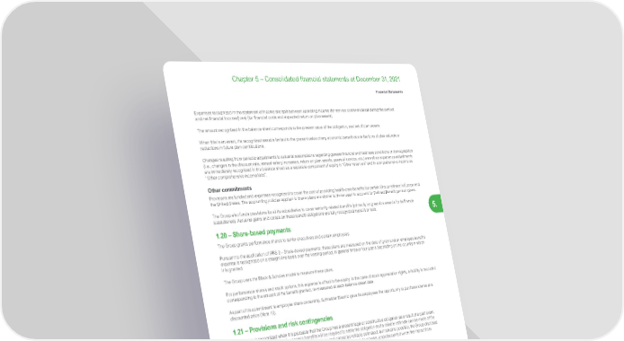 359 Life Is On | Schneider Electric www.se.com Financial Statements 5. Chapter 5 – Consolidated financial statements at December 31, 2021 Expenses recognized in the statement of income are split between operating income (for service costs rendered during the period) and net financial income/(loss) (for financial costs and expected return on plan assets). The amount recognized in the balance sheet corresponds to the present value of the obligation, and net of plan assets. When this is an asset, the recognized asset is limited to the present value of any economic benefit due in the form of plan refunds or reductions in future plan contributions. Changes resulting from periodic adjustments to actuarial assumptions regarding general financial and business conditions or demographics (i.e., changes in the discount rate, annual salary increases, return on plan assets, years of service, etc.) as well as experience adjustments are immediately recognized in the balance sheet as a separate component of equity in “Other reserves” and in comprehensive income as “Other comprehensive income/loss”. Other commitments Provisions are funded and expenses recognized to cover the cost of providing health-care benefits for certain Group retirees in Europe and the United States. The accounting policies applied to these plans are similar to those used to account for Defined Benefit pension plans. The Group also funds provisions for all its subsidiaries to cover seniority-related benefits (primarily long service awards for its French subsidiaries). Actuarial gains and losses on these benefit obligations are fully recognized in profit or loss. 1.20 – Share-based payments The Group grants performance shares to senior executives and certain employees. Pursuant to the application of IFRS 2 – Share-based payments , these plans are measured on the date of grant and an employee benefits expense is recognized on a straight-line basis over the vesting period, in general three or four years depending on the country in which it is granted. The Group uses the Black & Scholes model to measure these plans. For performance shares and stock options, this expense is offset in the equity. In the case of stock appreciation rights, a liability is recorded corresponding to the amount of the benefit granted, re-measured at each balance sheet date. As part of its commitment to employee share ownership, Schneider Electric gave its employees the opportunity to purchase shares at a discounted price (Note 19). 1.21 – Provisions and risk contingencies A provision is recognized when it is probable that the Group has a present legal or constructive obligation as a result of a past event, it is probable that an outflow of economic benefits will be required to settle the obligation and a reliable estimate can be made of the amount of the obligation. If the loss or liability is not likely and cannot be reliably estimated, but remains possible, the Group discloses it as a contingent liability. Provisions are calculated on a case-by-case or statistical basis, and discounted when the impact from discounting is significant. Provisions are primarily set aside to cover: • economic risks : these provisions relate to probable tax risks arising on positions taken by the Group or its subsidiaries. Each position is assessed individually and not offset, and reflects the best estimate of the risk at the end of the reporting period. Where applicable, it includes any late-payment interest and fines. In accordance with IFRIC 23 – Uncertainty over income tax treatments , provisions covering uncertainties over income tax treatment are presented under “Accrued taxes and payroll costs” as of 1 st of January 2019; • customer risks : provisions for customer risks mainly integrate the provisions for losses at completion for some of long-term contracts. Provisions for expected losses are fully recognized as soon as they are identified; • product risks : these provisions comprise − statistical provisions for warranties: the Group funds provisions on a statistical basis for the residual cost of Schneider Electric product warranties not covered by insurance. The provisions are estimated with consideration of historical claim statistics and the warranty period; − provisions to cover disputes concerning defective products and recalls of clearly identified products. • environmental risks : these provisions are primarily funded to cover clean-up costs. The estimation of the expected future outflows is based on reports from independent experts; • restructuring costs , when the Group has prepared a detailed plan for the restructuring and has either announced or started to implement the plan before the end of the year. The estimation of the liability includes only direct expenditure arising from the restructuring. 1.22 – Financial liabilities Financial liabilities primarily comprise bonds, commercial paper and short and long-term bank borrowings. These liabilities are initially recorded at fair value, from which any direct transaction costs are deducted. Subsequently, they are measured at amortized cost based on their effective interest rate.