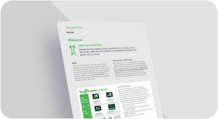 www.se.com Schneider Electric Universal Registration Document 2021 18 Integrated report What we do Infrastructure of the Future Infrastructure is the backbone of society. Schneider Electric’s technology, services, and expertise enable cities and companies to make infrastructure more reliable, safer, greener, and more efficient. Grids Sustainable, flexible, efficient, and resilient power grids are fundamental to accelerate the energy transition. In addition to providing innovative electrical equipment, such as switchgear that uses pure air instead of the SF 6 greenhouse gas, the company equips grid operators with data gathering, management, and analytics capabilities that unlock grids of the future . These digital grid transformations further enable the decarbonization of buildings, industry, and mobility. Transportation infrastructure Many governments, cities, and transit authorities are pioneering mobility and infrastructure projects using end-to-end EV charging solutions, renewables, battery storage, and microgrids. Schneider Electric makes this possible through a foundation of digital, future- proof, financially innovative, and services-based infrastructure solutions. These solutions modernize and digitize diverse transportation infrastructure including buses, metros, railways, and airports, speeding up the transition to low-carbon mobility. Business Brookville Bus Depot A first-of-its-kind “Energy as a Service” infrastructure electrification project ensuring the bus fleet’s continuous operation regardless of utility outages. Backed by renewables, it advances Montgomery County’s 2035 net-zero carbon emissions goal. The project is set to deliver sustainable and resilient energy and charging infrastructure supporting at least 44 electric buses at Brookville Smart Energy Bus Depot. • Solutions installed: solar PV, on-site generation, battery energy storage, microgrid controls, and electric bus chargers • 62% carbon reduction from buses eliminating lifetime ~155,000 tons of GHG • 99.999% resilience and reliability of operations and sized to handle peak-demand • Turnkey Energy-as-a-Service solution Innovations introduced in 2021 include: • SM AirSeT and RM AirSeT are digital MV switchgear ranges using pure air technology, eliminating the need for the SF 6 greenhouse gas. • EcoStruxure ™ ADMS (Advanced Distribution Management System) latest release provides utilities with new capabilities in coping with far-reaching effects of climate change • EcoStruxure ™ DERMS (Distributed Energy Resource Management System) provides active network management for greater grid flexibility. • EcoStruxure ™ Power Automation System provides digital automation for more efficient operation and maintenance programs. • EcoStruxure ™ EV Advisor is a platform for building owners and EV drivers to control EV charging remotely. • ETAP Train Power Simulation - eTraX ™ is software for designing, analyzing, and managing AC and DC railway infrastructure. 80% of global CO 2 emissions come from the production and consumption of energy (1) 60% rise in CO 2 emissions from transportation by 2050 in absence of mitigation measures (2) for eMobility Apps, Analytics, & Services EcoStruxure ™ Microgrid Advisor EcoStruxure ™ Power Advisor Edge Control EcoStruxure ™ Microgrid Operation EcoStruxure ™ Power SCADA Operation (PSP) Connected Products PowerLogic Masterpact EaserMV Relay Energy Control Centers (1) OECD/IEA (2020), World Energy Outlook, Climate Watch (2020), Historical GHG emissions, Schneider Electric Research (2) Planete Energies