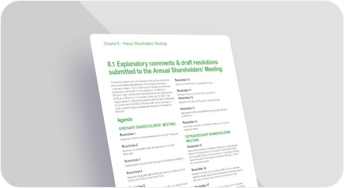 www.se.com Schneider Electric Universal Registration Document 2021 448 Chapter 8 – Annual Shareholders’ Meeting 8.1 Explanatory comments & draft resolutions submitted to the Annual Shareholders’ Meeting This section presents the draft resolutions that will be submitted to the Annual Shareholders’ Meeting of the Company that will be convened on May 5, 2022 and the report of the Board of Directors (explanatory comments) for those resolutions. The Board of Directors’ report and the draft resolutions are the one approved by the Board of Directors in its meeting of February 16, 2022. They may be subject to further amendments in the final Notice of Meeting to be published in the BALO official journal, where necessary, in order to take into account subsequent decisions of the Board of Directors. Agenda ORDINARY SHAREHOLDERS’ MEETING: Resolution 1 Approval of statutory financial statements for the 2021 fiscal year Resolution 2 Approval of consolidated financial statements for the 2021 fiscal year Resolution 3 Appropriation of profit for the fiscal year and setting the dividend Resolution 4 Approval of regulated agreements governed by Article L. 225-38 et seq. of the French Commercial Code Resolution 5 Reappointment of Mazars as statutory auditor; no reappointment and no replacement of Mr. Thierry Blanchetier as substitute statutory auditor Resolution 6 Appointment of PricewaterhouseCoopers Audit as statutory auditor; no reappointment and no replacement of Auditex as substitute statutory auditor Resolution 7 Approval of the information on the Directors’ and the Corporate officer’s compensation paid or granted for the fiscal year ending December 31, 2021 mentioned in Article L. 22-10-9 of the French Commercial Code Resolution 8 Approval of the components of the total compensation and benefits of all types paid during the 2021 fiscal year or awarded in respect of the said fiscal year to Mr. Jean-Pascal Tricoire Resolution 9 Approval of the Corporate Officer (Chairman and Chief executive officer)’s compensation policy Resolution 10 Approval of the Directors’ compensation policy Resolution 11 Renewal of the term of office of Mrs. Linda Knoll Resolution 12 Renewal of the term of office of Mr. Anders Runevad Resolution 13 Appointment of Mrs. Nivedita Krishnamurthy (Nive) Bhagat as a Director Resolution 14 Authorization granted to the Board of Directors to buy back Company shares EXTRAORDINARY SHAREHOLDERS’ MEETING: Resolution 15 Authorization granted to the Board of Directors to freely allocate shares to the employees or to a category of employees and/or the Corporate Officers of the Company or of companies affiliated therewith as part of the Long-Term Incentive Plan up to a limit of 2% of the share capital Resolution 16 Delegation of authority to the Board of Directors to undertake capital increases reserved for participants in a company savings plan without shareholders’ preferential subscription right Resolution 17 Delegation of authority to the Board of Directors to undertake capital increases reserved for employees of certain non-French subsidiaries of the Group, directly or via entities acting to offer those employees benefits comparable to those offered to participants in a company savings plan without shareholders’ preferential subscription right Resolution 18 Review and approval of the plan to merge IGE+XAO into Schneider Electric Resolution 19 Powers for formalities