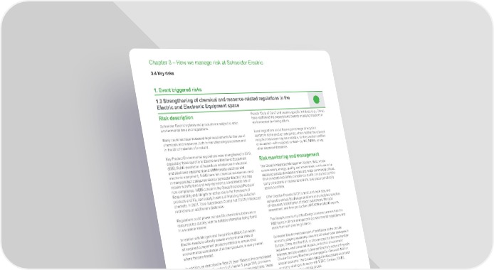www.se.com Schneider Electric Universal Registration Document 2021 256 Chapter 3 – How we manage risk at Schneider Electric 1. Event triggered risks 1.3 Strengthening of chemical and resource-related regulations in the Electric and Electronic Equipment space Risk description Schneider Electric’s plants and products are subject to strict environmental laws and regulations. Many countries have increased legal requirements for the use of chemicals and resources, both in manufacturing processes and in the bill of materials of products. Key Product Environmental regulations were strengthened in 2019, especially those specific to Electric and Electronic Equipment (EEE): RoHS (restriction of hazardous substances in electrical and electronic equipment) and WEEE (waste electrical and electronic equipment). RoHS bans ten chemical substances used in many product categories sold by Schneider Electric: this may require substitutions and may represent a considerable risk of non-compliance. WEEE concerns the Group Extended Producer Responsibility and obliges an active role in the framework of products end life, particularly in terms of financing the collection channels. In 2021, Toxic Substances Control Act (TSCA) introduced restrictions on additional substances. Regulations could phase out specific chemical substances or resources too quickly, with no suitable alternative being found in a scalable manner. In relation with Mergers and Acquisitions (M&A) Schneider Electric needs to critically assess environmental risks of all acquired companies’ product portfolios to ensure strict environmental compliance of all their products, in every market where they are traded. In addition, as described in Note 21 (see “Notes to the consolidated financial statements”, section 5 of chapter 5, page 381), provisions of EUR 350 million are set aside to cover environmental risks. These provisions are primarily funded to cover clean-up costs related to sites (not potential penalties). The estimation of the expected future outflows is based on reports from independent experts. French “Duty of Care” and country-specific initiatives (e.g., China) have reaffirmed the expectations towards engaging suppliers in environmental de-risking efforts. Local regulations could force a percentage of recycled content in some product categories, where neither the relevant recycled resources may be available, nor the product certified or accepted – with recycled content – by IEC, NEMA, or any other electrical standards. Risk monitoring and management The Group’s Integrated Management System (IMS), which covers safety, energy, quality, and environment, continues to be deployed across all industrial sites and major commercial offices. Environmental and Safety compliance audits, conducted by third- party consultants or internal specialists, take place periodically across countries. Offer Creation Process (OCP) is strict, and each step and deliverable embed EcoDesign ambitions and principles: selection of resources, identification of critical substances, life cycle assessment, and then production of REACH and RoHS reports. The Group’s community of EcoDesign business partners train the R&D teams in all new and upcoming environmental regulations and assist them with precise guidance. Schneider Electric has been part of taskforces on the circular economy, playing leadership roles in multi-stakeholder dialogues in Europe, China, and the USA, to discuss opportunities and hurdles: regulations, environmental impacts, protection of customers’ interests, and job creation. Schneider Electric is active in France’s Circular Economy Roadmap and engaged in China with MIIT on circular economy. The Group engages in discussions on circular economy relating to its sector with FIEEC, Gimélec, IGNES, ORGALIM, and other various circles. 1.4 Corruption linked to B2B and project business Risk description The exposure of the Group to corruption risk has been increasing for several years, due to the expansion of the Group’s activities in new economies, especially in Asia and Africa, through organic growth, and mergers and acquisitions. The business model of the Group relies on a large ecosystem of partners, including more than 52,000 suppliers throughout the world representing a procurement volume in excess of EUR 12 billion, and also, resellers and distributors. This ecosystem may represent a risk for the Group, being accountable for activities performed on its behalf, and in regards to potential conflicts of interest or unethical solicitations. In addition, the Group is participating in complex projects involving a large range of partners in sectors at risk, such as oil and gas, and with end-users from the public sector in countries at risk. Over the past years, the increase of law enforcement by public authorities, higher press coverage of fines imposed on companies, and new regulations requiring a strong compliance program have significantly changed the potential impact of corruption risks. Risk monitoring and management To mitigate this risk, Schneider Electric has built a dedicated Group Compliance Team, composed of corporate compliance counsels and regional compliance officers. Since August 2020, a new Ethics & Compliance department has been created, overseeing – among others – the Fraud Examination Team. 3.4 Key risks