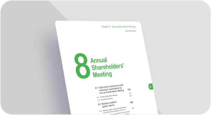 447 Life Is On | Schneider Electric www.se.com Chapter 8 – Annual Shareholders’ Meeting Shareholder Information 8. Annual Shareholders’ Meeting 8 8.1 Explanatory comments & draft resolutions submitted to the Annual Shareholders’ Meeting 448 8.1.1 Ordinary Shareholders’ Meeting 449 8.1.2 Extraordinary Meeting 456 8.2 Statutory Auditors’ special reports 468 8.2.1 Statutory Auditors’ report on the authorization to grant free shares existing or to be issued 468 8.2.2 Statutory auditors’ report on the issuance of shares or securities giving access to capital reserved for members of a company savings plan 469 8.2.3 Statutory Auditors’ report on the issuance of shares or securities reserved for a category of beneficiaries with cancellation of preferential subscription rights 470