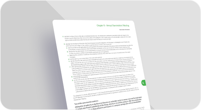 461 Life Is On | Schneider Electric www.se.com Chapter 8 – Annual Shareholders’ Meeting Shareholder Information 8. 4. decides to waive, in favor of the above-mentioned beneficiaries, the shareholders’ preferential subscription rights with respect to the shares or equity-linked securities that are the subject of this delegation which entails waiver of the shareholders’ preferential subscription right to shares to which securities that may be issued under this resolution would give right; 5. decides that the Board of Directors shall have full powers to use this delegation, with the power to subdelegate as permitted by law, within the limits and subject to the conditions specified above in order to, and in particular: a. set in accordance with applicable laws and regulations the scope of companies whose above mentioned beneficiaries may subscribe to the shares or equity-linked securities issued hereby and benefit, as the case may be, from shares or equity-linked securities, b. decide that the subscriptions may be made directly or through Company mutual funds (fonds commun de placement d’entreprise) or other structures or entities as permitted by applicable laws and regulations, c. determine the conditions, in particular those relating to seniority, which shall have to be met by the beneficiaries of the capital increases, d. set the opening and closing dates of the subscription periods, e. set the amounts of the issuances to be undertaken pursuant to this authorization and determine, in particular, the issuance prices, dates, time-periods, terms and conditions for the subscription, payment, settlement and dividend rights of the securities (which may be retroactive) as well as the other terms and conditions of the issuances, in accordance with applicable laws and regulations, f. when granting free shares or equity-linked securities, set the number of shares or equity-linked securities to be issued, the number to be granted to each beneficiary, and determine the dates, time periods, terms and conditions of granting such shares or equity- linked securities in accordance with applicable laws and regulations and, in particular, choose either to fully or partially substitute the granting of such shares or equity-linked securities for the discount to the reference price provided for above, or to allocate the value of such shares or equity-linked securities to the total amount of the employer contribution, or to combine these two possibilities, g. acknowledge the completion of capital increases in the amount of the shares that are subscribed (after possible reduction in the event of over-subscription), h. as the case may be, allocate the expenses of capital increases to the amount of premiums related thereto and deduct from this amount the sums necessary to increase the legal reserve to one-tenth of the new share capital resulting from such capital increases, enter into any agreements, carry out directly or indirectly through an agent all transactions and terms, including any formalities following the capital increases and subsequent modifications to the Company’s Articles of Association, generally, enter into any agreement in order to successfully complete the contemplated issuances, take all measures and decisions and carry out all formalities necessary for the completion of the issuance, listing and financial servicing of the securities issued pursuant to this authorization as well as the exercise of rights attached thereto or subsequent to the completed capital increases. This delegation (i) cancels, effective August 1 st , 2022, the authorization given by the Annual Shareholders’ Meeting of April 28, 2021, in its 22 nd resolution, for its amounts unused by the Board of Directors and (ii) is granted for a period of twenty-six (26) months as from this Shareholders’ Meeting. Text of the seventeenth resolution (Delegation of authority to the Board of Directors to undertake capital increases reserved for employees of certain non-French subsidiaries of the Group, directly or via entities acting to offer those employees benefits comparable to those offered to participants in a company savings plan without shareholders’ preferential subscription right) The Annual Shareholders’ Meeting, having satisfied the quorum and majority requirements for extraordinary shareholders’ meetings, having heard the Board of Directors’ report and the statutory auditors’ special report, and in accordance with the provisions of Articles L. 225-129 to L. 225-129-6, L. 225-138 ,and L. 228-92 et seq. of the French Commercial Code: 1. delegates to the Board of Directors, with the power to subdelegate, in compliance with applicable laws and regulations, the necessary powers to decide one or several capital increases through the issue, in the proportions and at the times it deems appropriate up to a maximum of 1% of the share capital on the date of this Shareholders’ Meeting, by issuing ordinary shares or securities providing access through any means, immediately and/or in the future, to ordinary shares of the Company, such issue to be reserved for persons meeting the characteristics of the class defined below; it being specified that (i) such limit shall be charged against the limits set forth in the 16 th resolution of this Annual Shareholders’ Meeting, and (ii) this delegation may be used only from and after August 1 st , 2022; 2. decides to waive the shareholders’ preferential right to subscribe for shares or other securities granting access to the share capital pursuant to this resolution and to reserve the right to subscribe to one and/or another class of beneficiaries or recipients having the following characteristics: (i) employees and officers of companies of Schneider Electric Group affiliated with the Company under the terms and conditions set forth in Article L. 225-180 of the French Commercial Code and Article L. 3344-1 of the French Labour Code and the head office of which is located 
