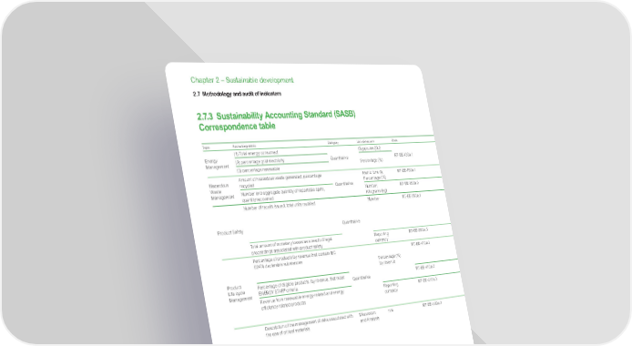 www.se.com Schneider Electric Universal Registration Document 2021 218 Chapter 2 – Sustainable development 2.7 Methodology and audit of indicators 2.7.3 Sustainability Accounting Standard (SASB) Correspondence table Topic Accounting metric Category Unit of measure Code Response/ Data/ Reference Topic Energy Management (1) Total energy consumed Quantitative Gigajoules (GJ) R T- E E -13 0 a .1 The following KPIs covers our measured energy consumption (about 81% of Group energy consumption): (1) 3,889,318 GJ (1,080,366 MWh) (2) 37.0% (399,564 MWh) (3) 58.3% (629,844 MWh) Energy Management (2) percentage grid electricity Percentage (%) (3) percentage renewable Hazardous Waste Management Amount of hazardous waste generated, percentage recycled Quantitative Metric tons (t), Percentage (%) R T- E E -15 0 a .1 Hazardous waste generated: 8,549 tons. Hazardous waste channeled according to Schneider Electric expectations: 8,549 tons. Hazardous Waste Management Number and aggregate quantity of reportable spills, quantity recovered Number, Kilograms (kg) RT- EE-150a.2 Zero reportable spills in 2021, therefore no recovered quantity to report. Product Safety Number of recalls issued, total units recalled Quantitative Number R T- E E -2 5 0 a .1 14 product recalls have been issued in 2021. Schneider Electric has an Offer Safety Alert (OSA) process to alert the relevant Line of Business and other interested parties as soon as it is suspected that customers’ health or property safety may be put at risk by Schneider products, solutions, or projects. The Offer Safety Alert Committee (OSAC) is a permanent corporate committee that oversees and regulates the management of OSA. Its mission is to ensure all OSA are managed with the due diligence and urgency to minimize safety risks to customers. Its independent, multi-discipline nature allows the OSAC to make decisions in our customers’ best interest. Product Safety Total amount of monetary losses as a result of legal proceedings associated with product safety Reporting currency RT-EE-250a.2 No material loss at the Group level. Product Life cycle Management Percentage of products by revenue that contain IEC 62474 declarable substances Quantitative Percentage (%) by revenue R T- E E - 410 a .1 Around 60 to 70% of our products (by turnover) contain IEC 62474 substances (which covers 37 worldwide regulations and about 160 substance families). With the current information collected from our supply chain, we manage to cover nearly all substances and regulations. Information disclosed for our Green Premium products covers these substances. More details on Green Premium in section 2.4.3 “Green offers” page 156. Product Life cycle Management Percentage of eligible products, by revenue, that meet ENERGY STAR ® criteria RT- EE- 410a.2 This metric is not relevant at global level as it is only applicable in US and Canada. Revenues derived from ENERGY STAR UPS are included in our Impact Revenues measure (see below). Revenue from renewable energy-related and energy efficiency-related products Reporting currency RT-EE-410a.3 Schneider Electric measures “Impact revenues” (previously “Green revenues”), ie revenues coming from offers that bring energy, climate, or resource efficiency to our customers, while not generating any significant harmful impact to the environment. In 2021, 71% of Group revenues qualify as Impact revenues. The Group aims to grow its Impact revenues to 80% by 2025 as part of SSI 2021-2025. Materials Sourcing Description of the management of risks associated with the use of critical materials Discussion and Analysis n/a RT-EE-440a.1 Details regarding our sustainable procurement practices are provided in section 2.2.11 “Sustainable relations with suppliers” page 117, in particular our Vigilance plan, Conflict Minerals and cobalt programs. When the country of origin is known to be in the conflict zone, 100% of the smelters and refiners were verified conformant. Therefore, the Group has no reason to believe that any conflict minerals the Group sourced, have directly or indirectly financed or benefitted armed conflict in the covered countries. The Group is exposed to fluctuations in energy and raw material prices, in particular steel, copper, aluminum, silver, lead, nickel, zinc and plastics. The Group has implemented certain procedures to limit exposure to rising non-ferrous and precious raw material prices. The Purchasing departments of the operating units report their purchasing forecasts to the Corporate Finance and Treasury department. Purchase commitments are hedged using forward contracts, swaps and, to a lesser extent, options. Materials Sourcing Business Ethics Description of policies and practices for prevention of: (1) corruption and bribery and (2) anti-competitive behavior Discussion and Analysis n/a R T- E E - 510 a .1 As stated in its Trust Charter and Anti-Corruption Code of Conduct, Schneider Electric is committed to comply with all applicable laws and regulations, such as the OECD’s Convention on Combating Bribery of Foreign Public Officials in International Business Transactions, the US Foreign Corrupt Practices Act (FCPA), the UK Bribery Act, and the French Sapin II law. Schneider Electric applies a zero-tolerance policy towards corruption and other unethical business practices and considers that “doing things right” is a key value-creation driver for all its stakeholders. We count on our employees and third parties to promote business integrity. A thorough description of our policies and practices is provided in sections ‘Prohibit any Form of Corruption” and “Require Third-Party Integrity” of the Trust Charter. Business Ethics Total amount of monetary losses as a result of legal proceedings associated with bribery or corruption Quantitative Reporting currency RT- EE- 510a. 2 No material losses. Total amount of monetary losses as a result of legal proceedings associated with anticompetitive behavior regula